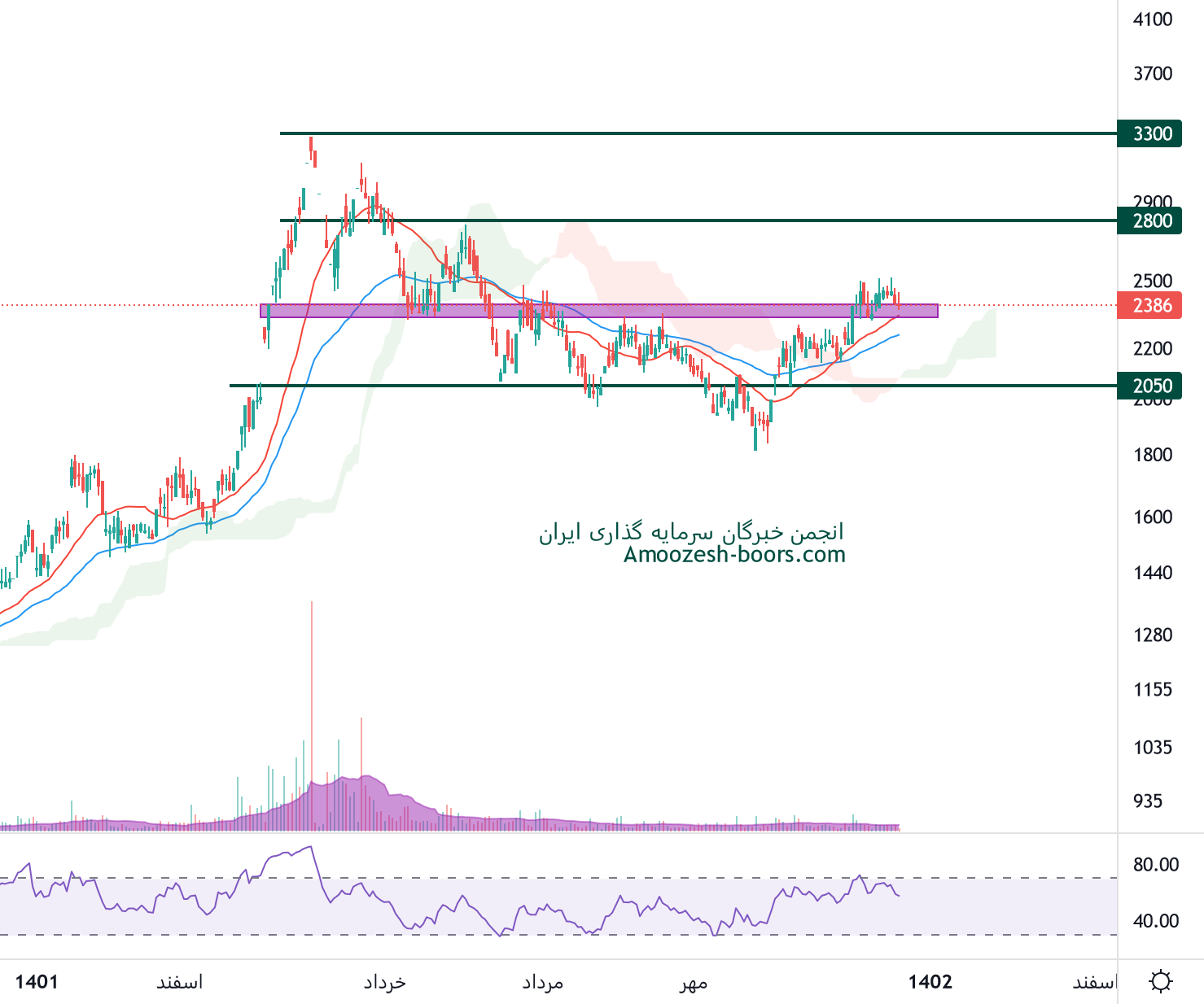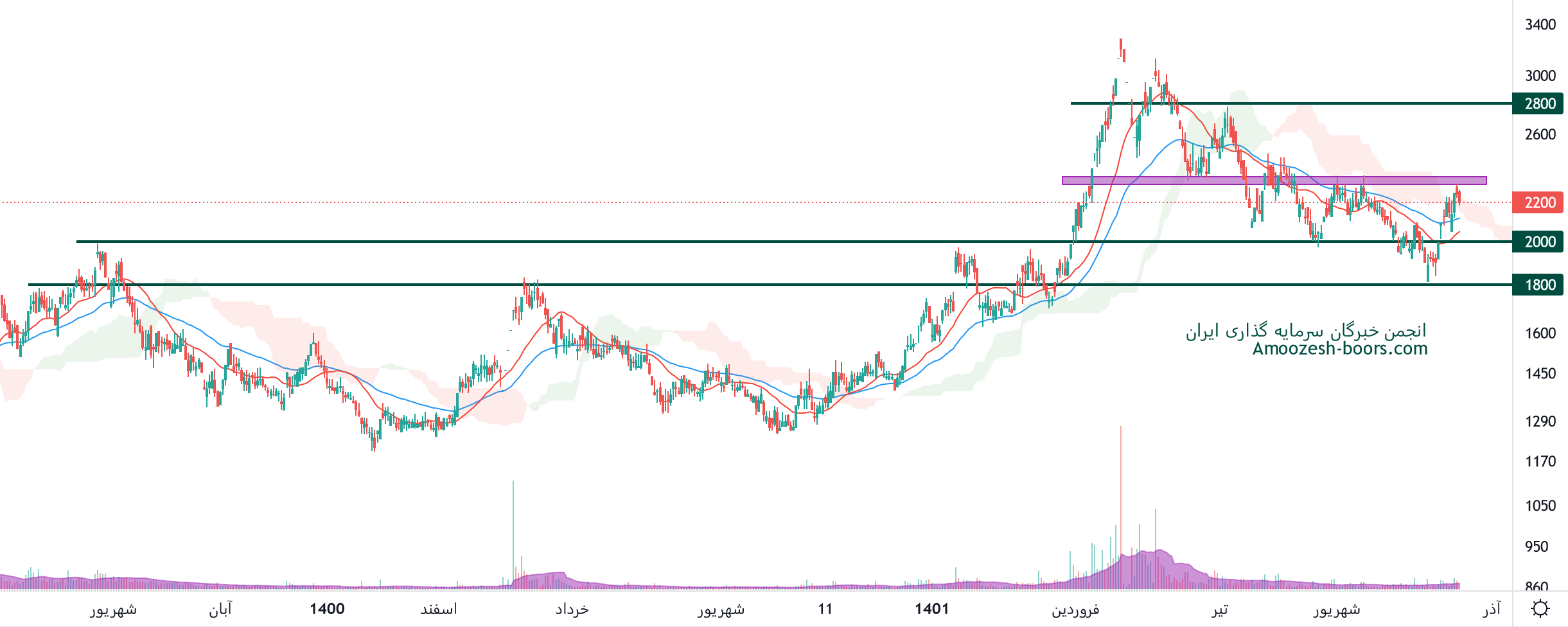 مقاومت نماد ثامید از ناحیه پر تراکم 2400 ریال تشکیل شده است و با توجه به شرایط بازار شکست مقاومت و رسیدن به تارگت 2800 ریال خوش بینانه میباشد.