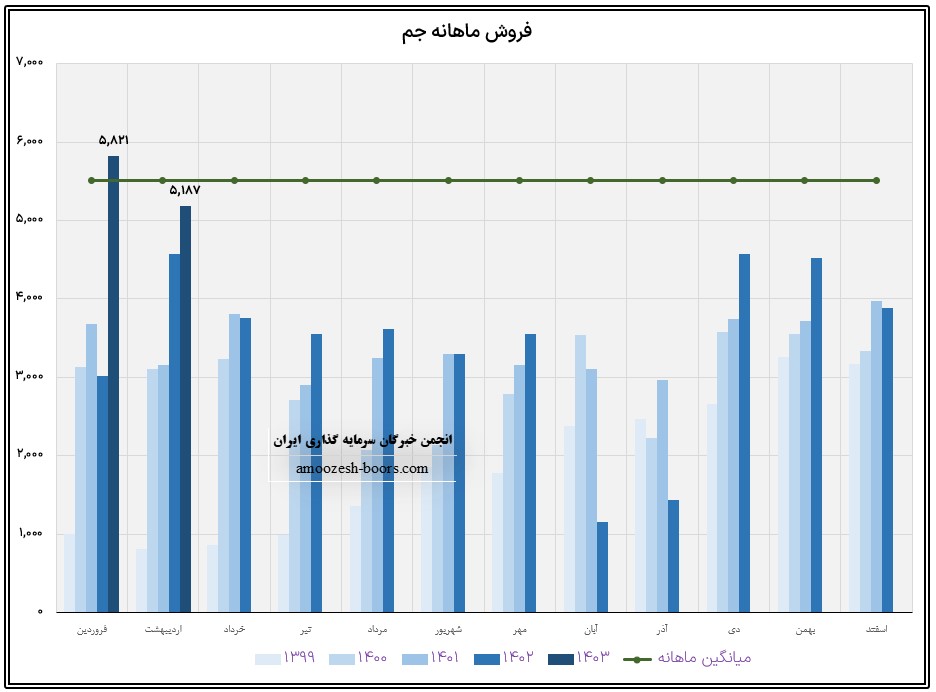 پتروشیمی جم با نماد جم در این ماه به فروش 5820.8 میلیارد تومانی دست یافت. فروش ماهانه جم در مقایسه با ماه گذشته 50% و در مقایسه به فروردین سال گذشته 93% افزایش داشته است.