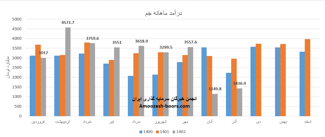 فروش آذر ماه سال 1402 سهم جم 1436.9 میلیارد تومان گزارش شده است که از این درآمد 92% آن از محل فروش داخلی و مابقی از طریق فروش صادراتی تامین گردیده است، تغییرات درآمدی جم به شرح زیر میباشد: