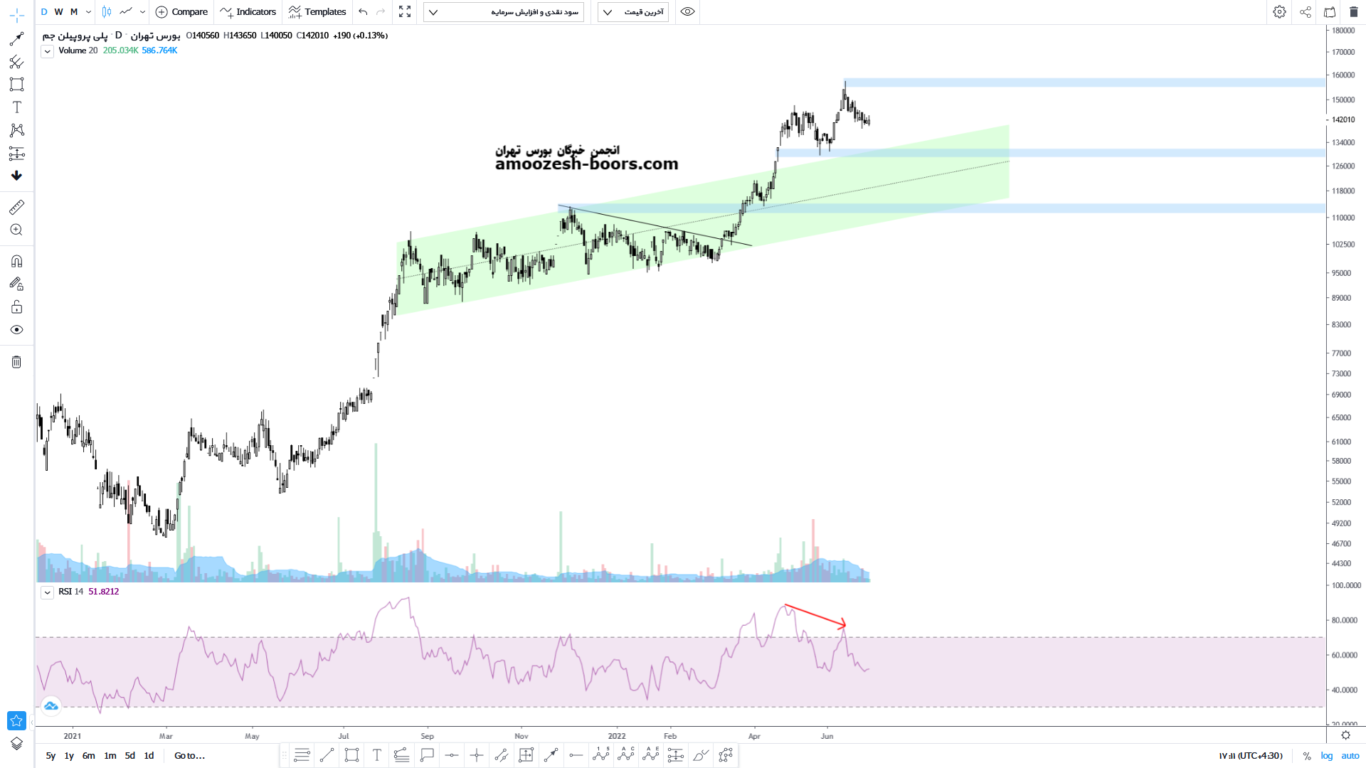 قیمت نماد جمپیلن پس از رشد از محدوده معرفی شده در تحلیل قبل توانست با شکست مقاومت های مهم خود و خروج از کانال صعودی به سطوح بالایی از قیمت دست پیدا کند. اما اکنون با ایجاد واگرایی بین دو قله آخر پیش بینی اصلاح بیشتر را برای قیمت داریم. اکنون قیمت حمایت محدوده ۱۳ هزار تومان را پیش روی خود دارد در صورت حمایت می تواند مجددا تا سقف تاریخی خود یعنی حدود ۱۶ هزار تومان رشد کند اما در صورت شکست این کف حمایتی انتظار اصلاح بیشتر را برای قیمت تا محدوده حمایتی ۱۱,۵۰۰ تومان را نیز برای قیمت داریم.