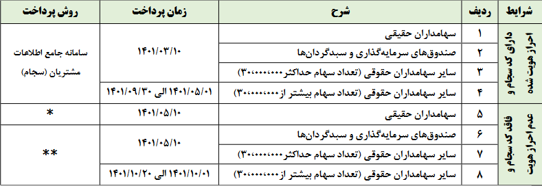 سود تقسیمی مصوب عمومی با همکاری شرکت سپرده گذاری مرکزی اوراق بهادار و تسویه وجوه (سهامی عام) از طریق سامانه جامع اطلاعات مشتریان (سجام) به سهامداران پرداخت می گردد.