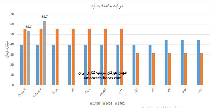 درآمد نماد حتاید مجددا تکرار شده است و 63.7 میلیارد تومان گزارش شده است که تغییری با 2 ماهه گذشته خود نداشته است، اما درآمد ماهانه حتاید نسبت به متوسط ماهانه و مدت مشابه به ترتیب از افزایش 6 و 15 درصدی برخوردار بوده است، مجموع عملکرد 4 ماهه سهم حتاید در مقایسه با 4 ماهه سال گذشته افزایش 10 درصدی داشته و طی این مدت 45% از کل درآمد سال قبل تحقق پذیرفته است.