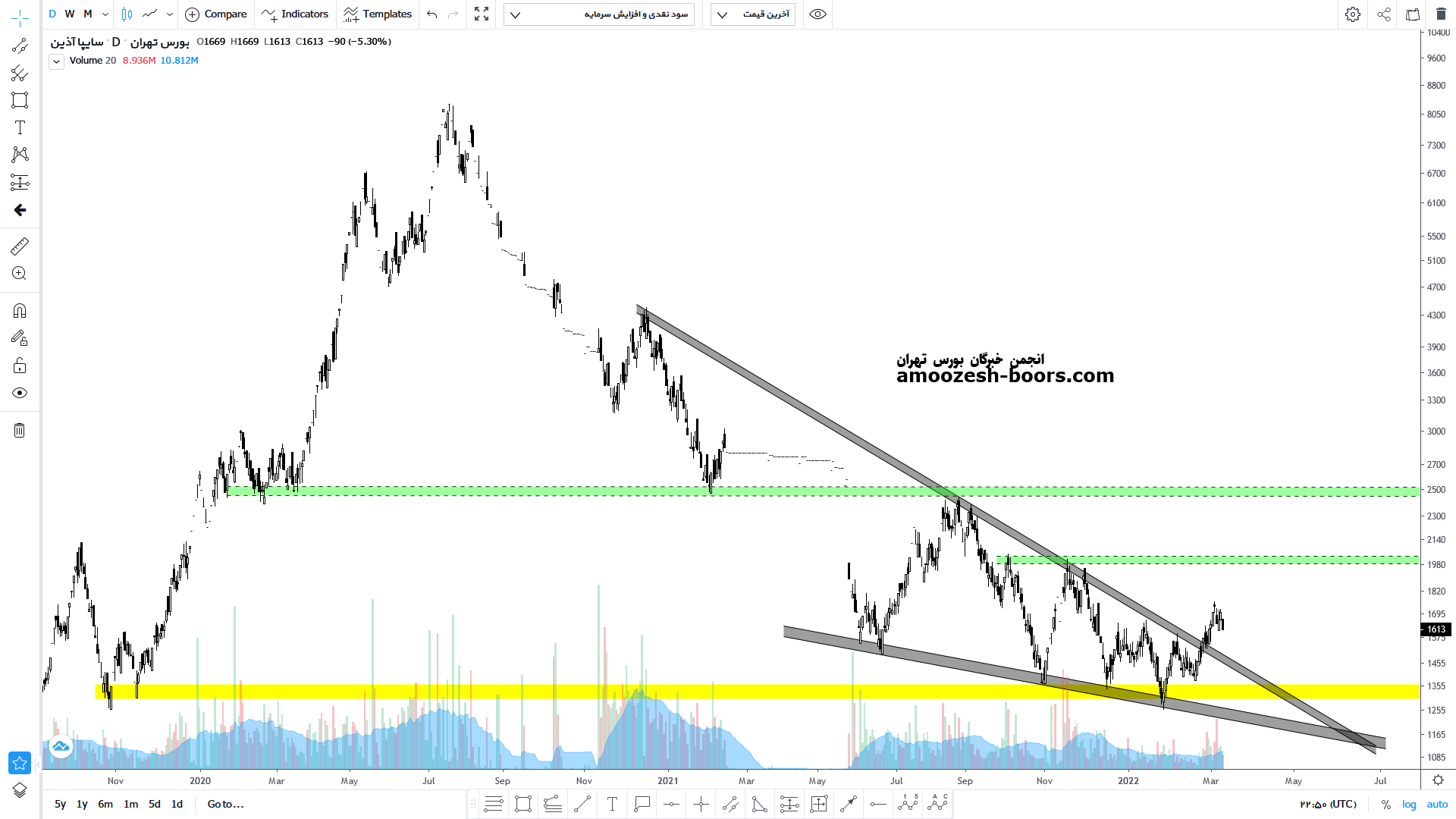 قیمت پس از شکست خط روند نزولی خود درحال پولبک به این خط روند شکسته شده می باشد که در صورت تایید این پولبک می تواند تا مقاومت های محدوده ۲۰۰ تومان و سپس در صورت شکست تا مقاومت محدوده ۲۴۰ تومان نیز رشد خود را ادامه دهد.