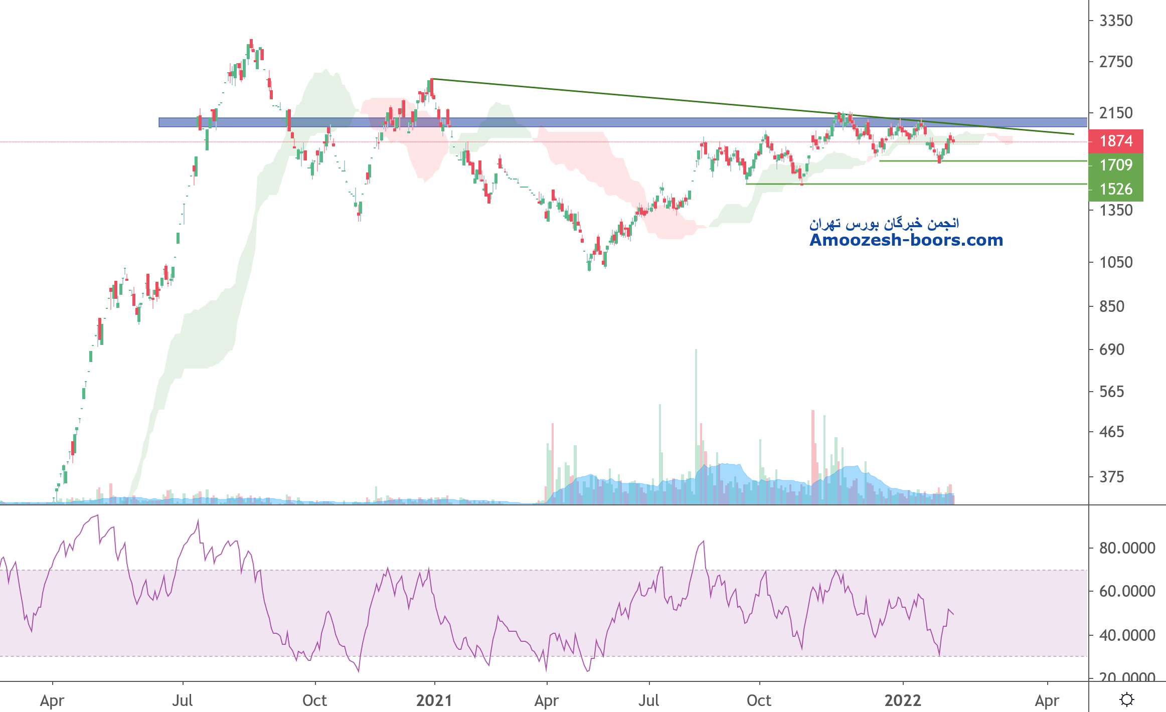 مقاومت معتبر 2000 ریال مانع حرکت صعودی سهم و موجب اصلاح قیمت تا محدوده 1700 را محتمل مینماید و قیمت میتواند در این محدوده در نوسان باشد.