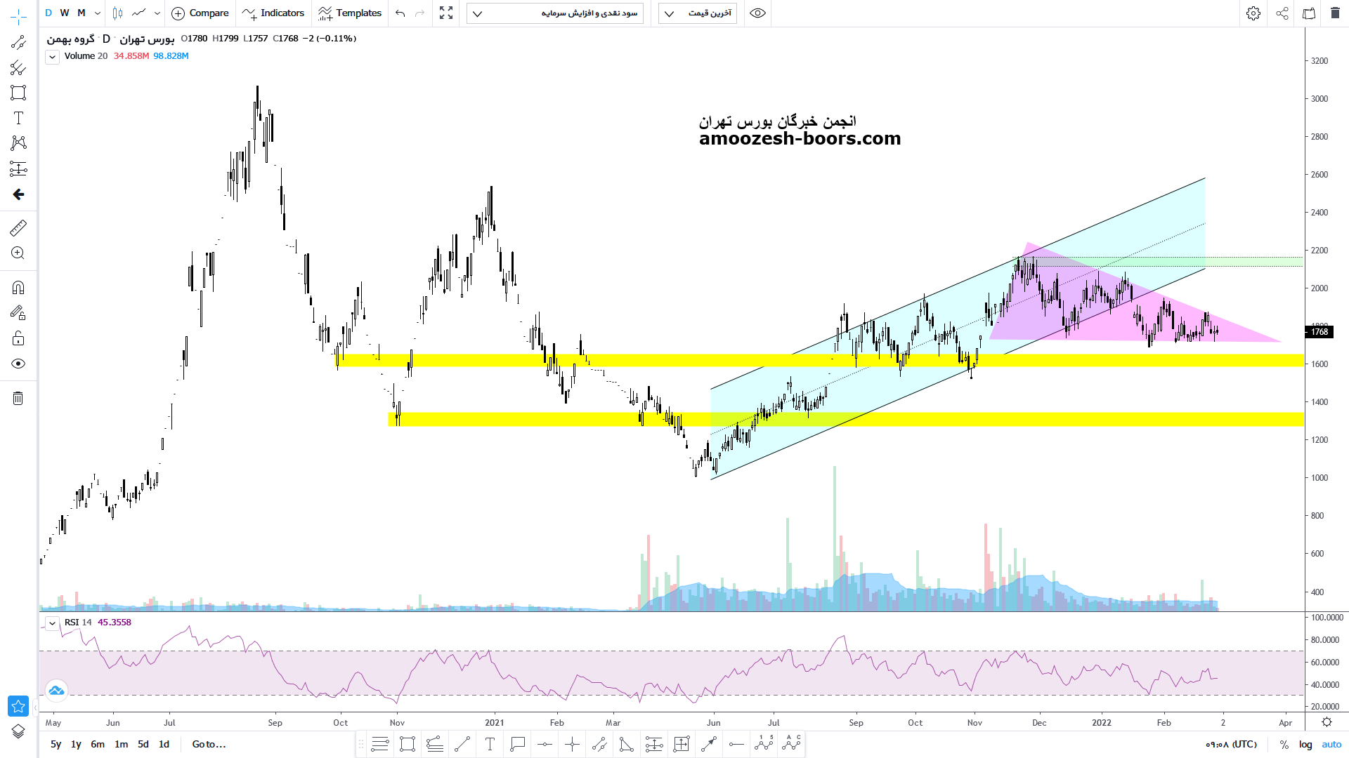قیمت پس از موج صعودی که در قالب یک کانال صعودی داشت وارد اصلاح شده در قالب یک مثلث کاهشی اصلاح خود را انجام داده است اکنون با توجه به فشردگی انتهای الگو انتظار شکست از کف را داریم در صورت بروز این اتفاق قیمت می تواند از محدوده حمایتی ۱۶۰ تومان و سپس در صورت شکست آن از محدوده حمایتی ۱۳۰ تومان برگشتی را داشته باشد اما در صورت شکست سقف کانال قیمت میتواند رشد خود را تا محدوده ۲۱۵ تومان ادامه دهد