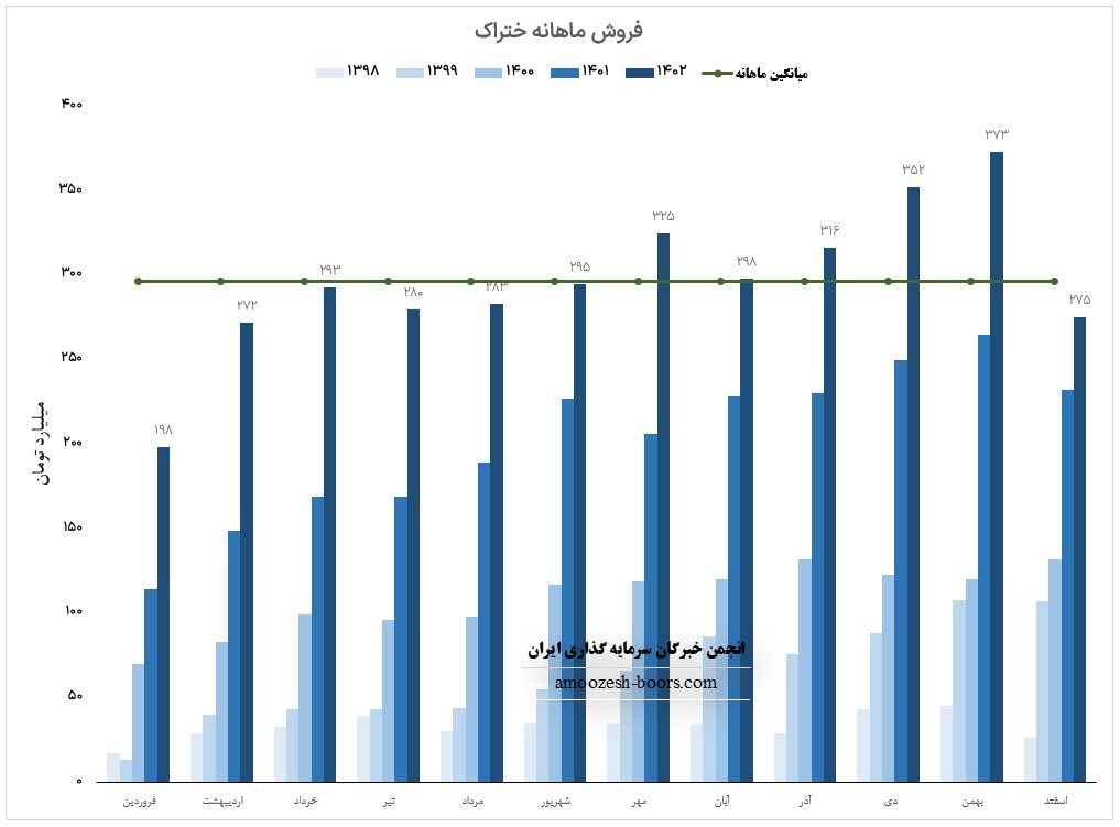 نماد ختراک در اسفند ماه حدود بیش از 5000 تن از محصولات خود را به فروش رسانده که این میزان در مقایسه با حجم فروش ماه گذشته خود حدود 26% افت پیدا کرده است.