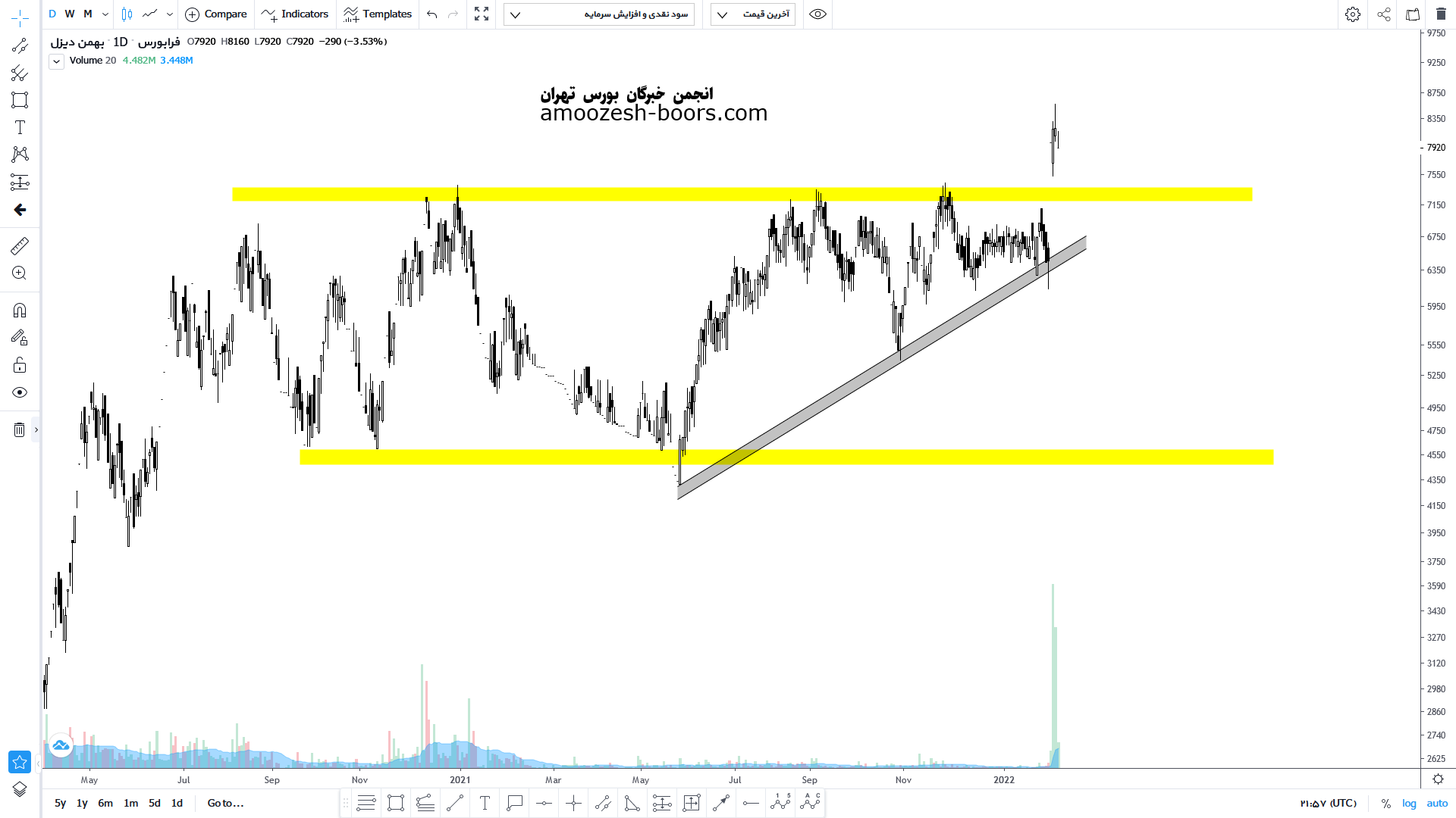 با توجه به افزایش سرمایه شرکت و برگزاری مجمع عمومی فوق العاده معاملات سهم از تاریخ ششم بهمن‌ماه بسته بوده با توجه به بازگشایی نماد در تاریخ ۱۷ اسفند ماه و تقاضای به وجود آمده باعث شده که نماد با گپ مثبت ۲۳ درصدی و بالای محدوده مقاومتی ۷۳۰ تومان بازگشایی شود. اکنون حمایت پیش روی سهم محدوده شکسته شده ۷۳۰ تومان می باشد که در صورت حمایت از این محدوده می‌تواند رشد خود را تا محدوده هزار تومان نیز ادامه دهد اما در صورت عدم حمایت و تمایل قیمت به ریزش بیشتر محدوده حمایتی خط روند صعودی خود را خواهد دید