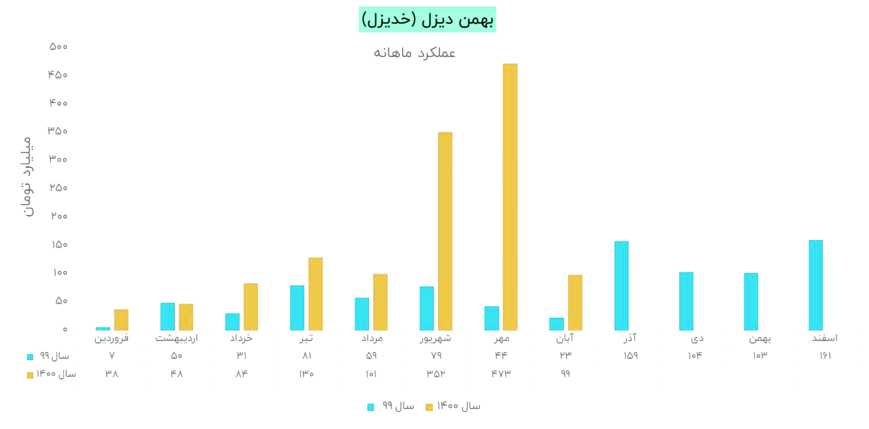 شرکت بهمن دیزل طی عملکرد 1 ماهه منتهی به 1400/11/30 معادل 4,124,703 میلیون ریال از محصولات خود را به فروش رسانده است که نسبت به دوره 1 ماهه مشابه سال قبل 299% افزایش داشته است همچنین با رشد 8 درصدی نسبت به دی ماه به مبلغ فروش 412 میلیارد تومانی دست یافت. متوسط فروش ماهانه شرکت در 10 ماه گذشته سال برابر با 195 میلیارد تومان بوده است. خدیزل در بهمن 446 دستگاه انواع خودرو به فروش رساند که 14 درصد بیشتر از دی ماه و 80 درصد بیشتر از متوسط 10 ماه گذشته می باشد. نرخ فروش کامیونت 6 تن شرکت در این ماه برابر با 737 میلیون تومان به ازای هر دستگاه گزارش شده است که 2 درصد بیشتر از دی ماه می باشد.