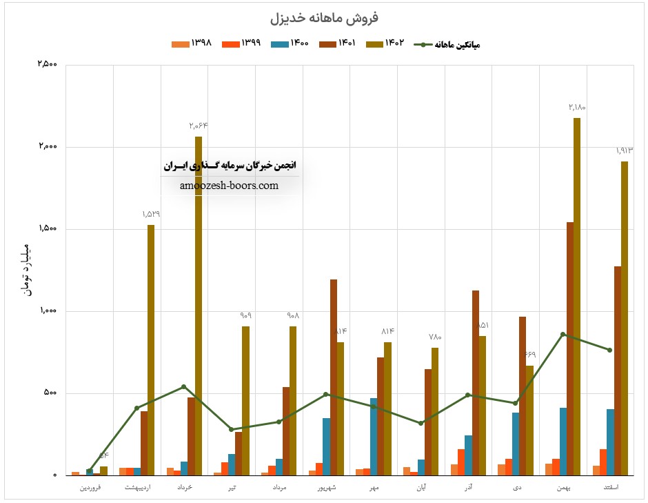 شرکت بهمن دیزل ( خدیزل ) در بهمن ماه 1402 فروش 2179.5 میلیارد تومانی را به دست آورده که افزایش 226 درصدی در مقایسه با ماه گذشته و همچنین رشد 128 درصدی نسبت به متوسط ماهانه داشته است،