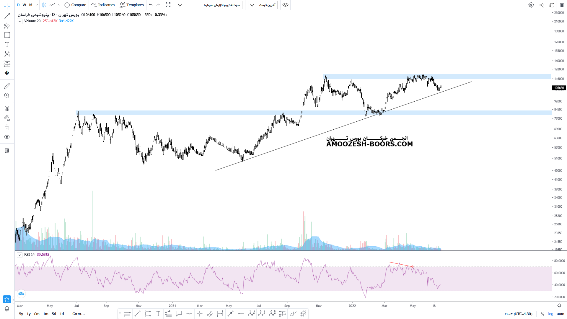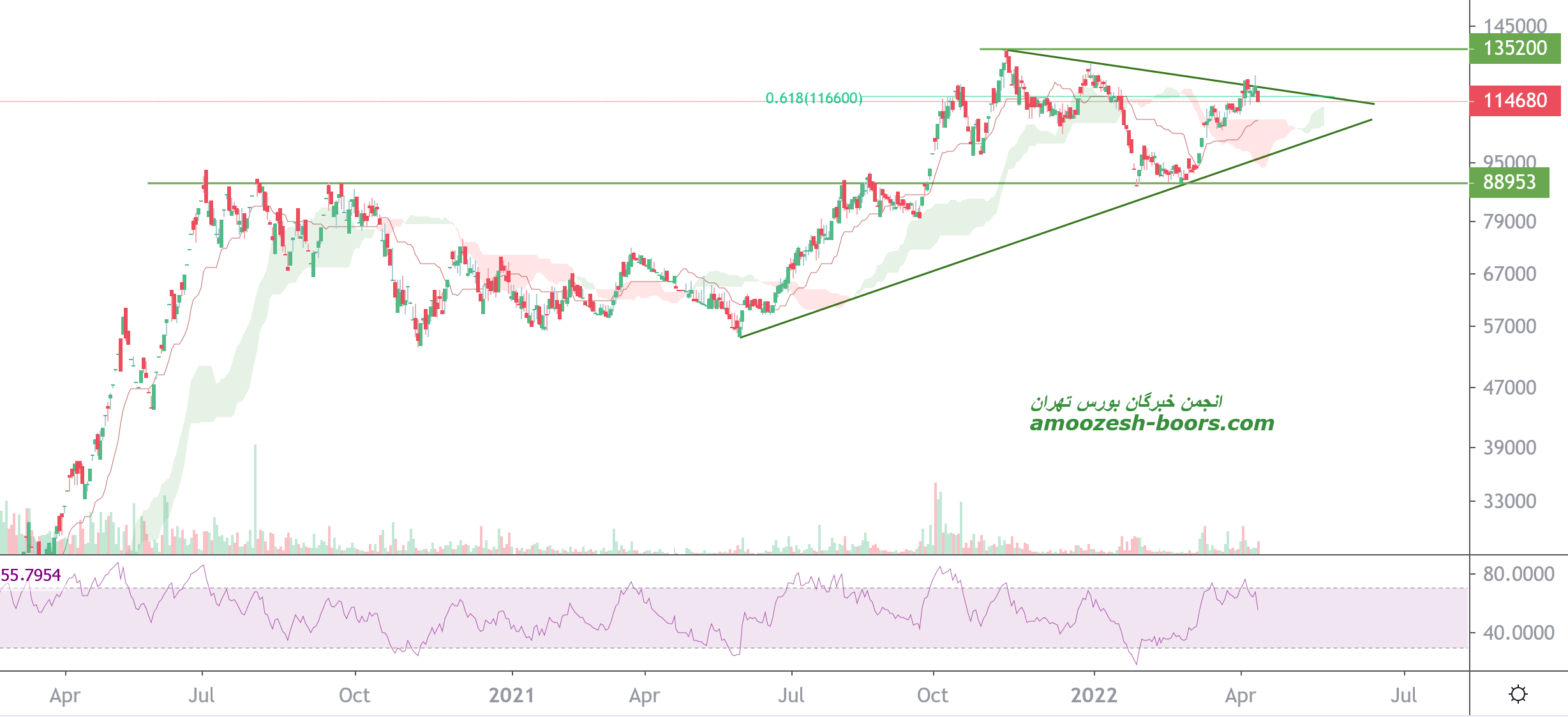 قیمت نماد خراسان در حال حاضر درگیر خط مقاومت داینامیک نزولی میباشد در صورت ادامه فشار خرید و شکستن این مقاومت و تثبیت بالای آن حرکت فیمت تا 135000 ریال محتمل خواهد بود و در صورتی که کندل های نزولی ادامه دار شوند اولین حمایت سهم 100000 ریال در نظر گرفته خواهد شد.
