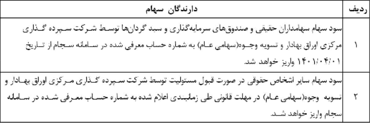 به استحضار می رساند پیرو تصمیمات مجمع عمومی عادی سالیانه مورخ ۱۴۰1/۰3/۱۰و تصويب سود نقدی به ازای هر سهم به مبلغ ۱۴.3۵۰ ریال، سود سهام طبق برنامه زمانبندی قبلی اعلام شده به شرح زیر پرداخت خواهد شد: