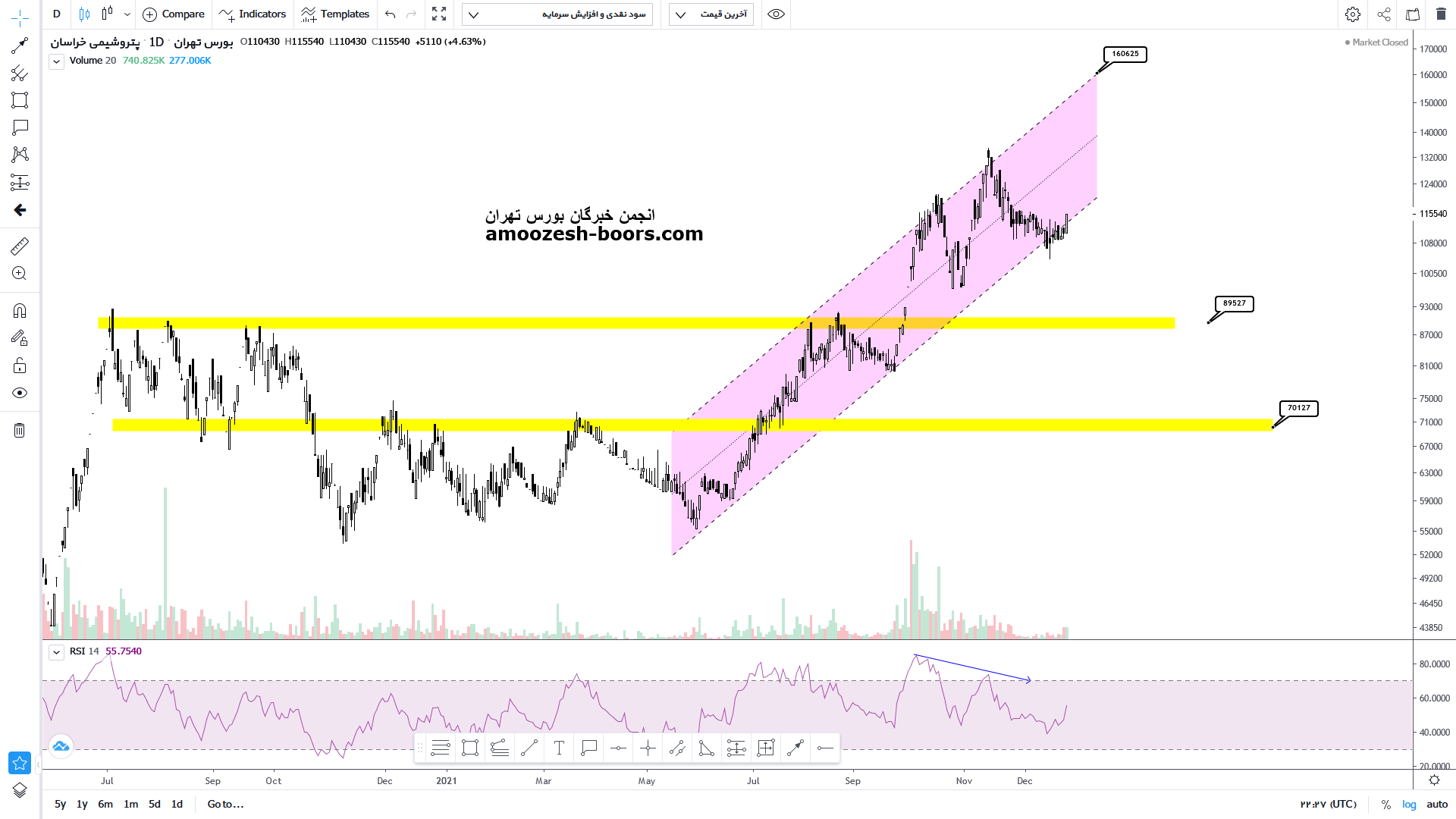قیمت نماد خراسان پس از رشد 150 درصدی درون یک کانال صعودی از کف حمایتی محدوده 5500 تومان، با برخورد به مقاومت سقف کانال و همچنین ایجاد واگرایی نزولی در اندیکاتور، تا کف کانال اصلاح کرده و نشانه های بازگشت در آن دیده میشود
