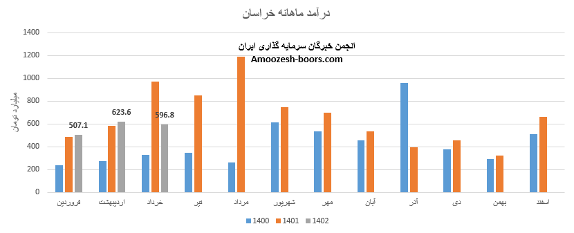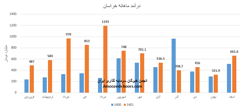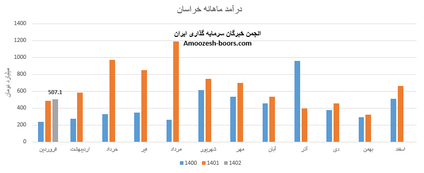 نماد خراسان با ثبت درآمدی برابر با متوسط ماهانه به رقم 661.6 میلیارد تومانی رسیده است، درآمد اسفند ماه سهم خراسان نسبت به ماه قبل رشد 106 درصدی داشته و نسبت به مدت مشابه نیز با رشد 29 درصدی همراه بوده است، علت افزایش درآمد نماد خراسان نسبت به ماه قبل رشد مقدار فروش اوره میباشد، نرخ فروش این محصول نسبت به ماه گذشته افت یک درصدی داشته است، مجموع درآمد 12 ماهه سهم خراسان نسبت به کل درآمد سال قبل 52% بیشتر گزارش شده است.