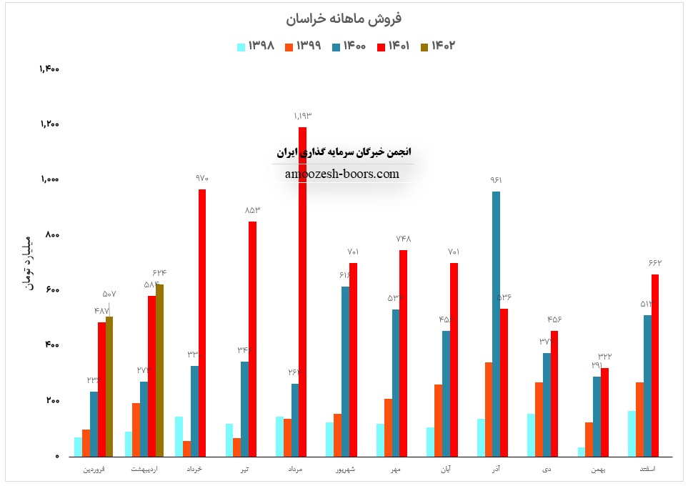 نماد خراسان در اردیبهشت ماه حدود بیش از 22900 تن از محصولات خود را در بازار داخلی و حدود بیش از 28900تن از محصولات خود را در بازار صادراتی به فروش رسانده است که مبلغ فروش داخلی معادل 248 میلیارد تومان و همچنین مبلغ فروش صادراتی معادل 375 میلیارد تومان به ثبت رسیده است.