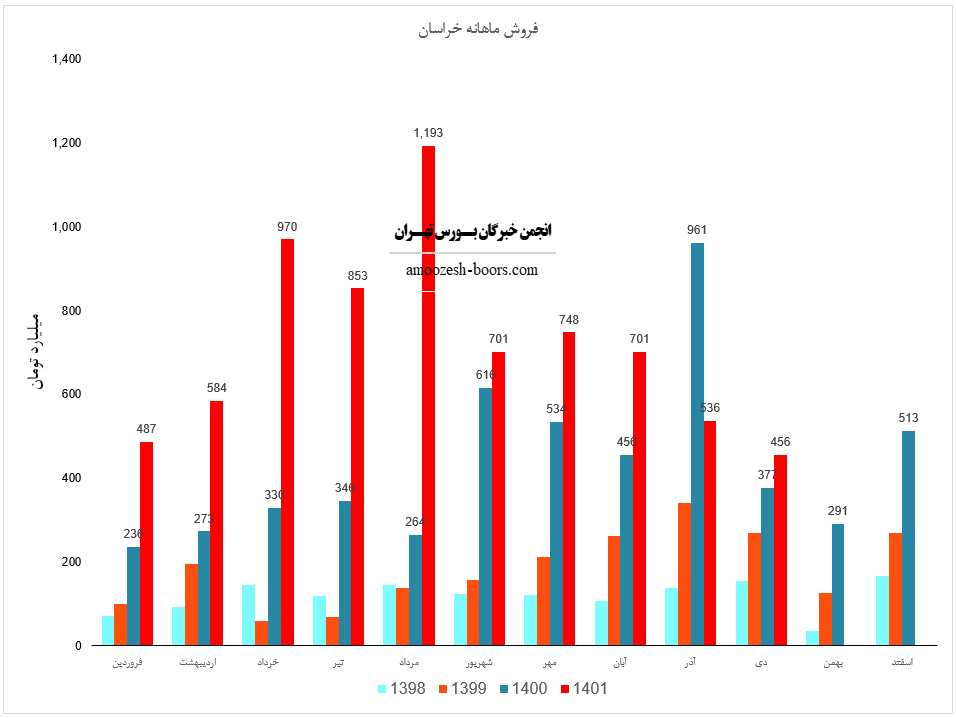 نماد خراسان در دی ماه حدود بیش از 3000 تن از محصولات خود را در بازار داخلی و حدود بیش از 30000 تن از محصولات خود را در بازار صادراتی به فروش رسانده است که مبلغ فروش داخلی معادل 49 میلیارد تومان و همچنین مبلغ فروش صادراتی معادل 407 میلیارد تومان به ثبت رسیده است.
