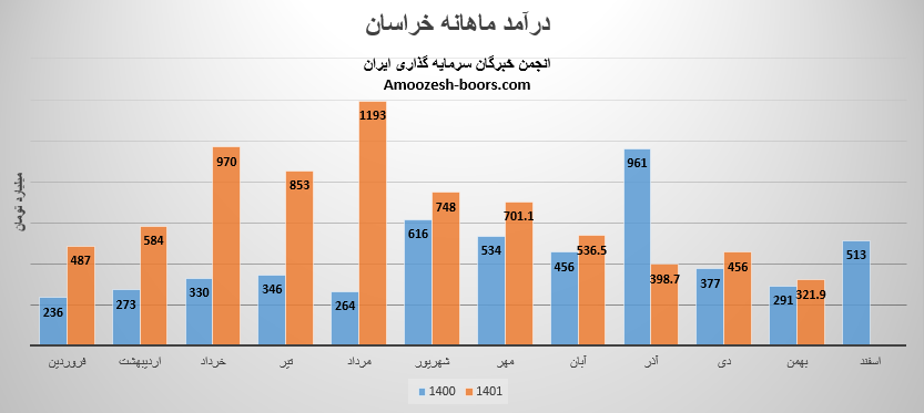 شرکت پتروشیمی خراسان (نماد خراسان) در گزارش آبان ماه 1401 به درآمد 536.5 میلیارد تومانی رسیده است، 43% از این درآمد از طریق فروش داخلی و مابقی از طریق صادرات تامین گردیده است. تغییرات درآمد ماهانه سهم خراسان به شرح زیر میباشد :