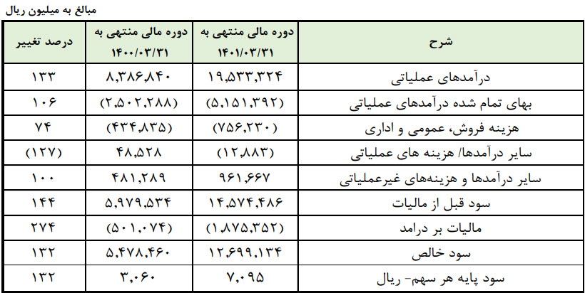 سود ناخالـص: 3301 میلیارد تومان که نسبت به دوره مشابه گذشته 132% افزایش یافته است.