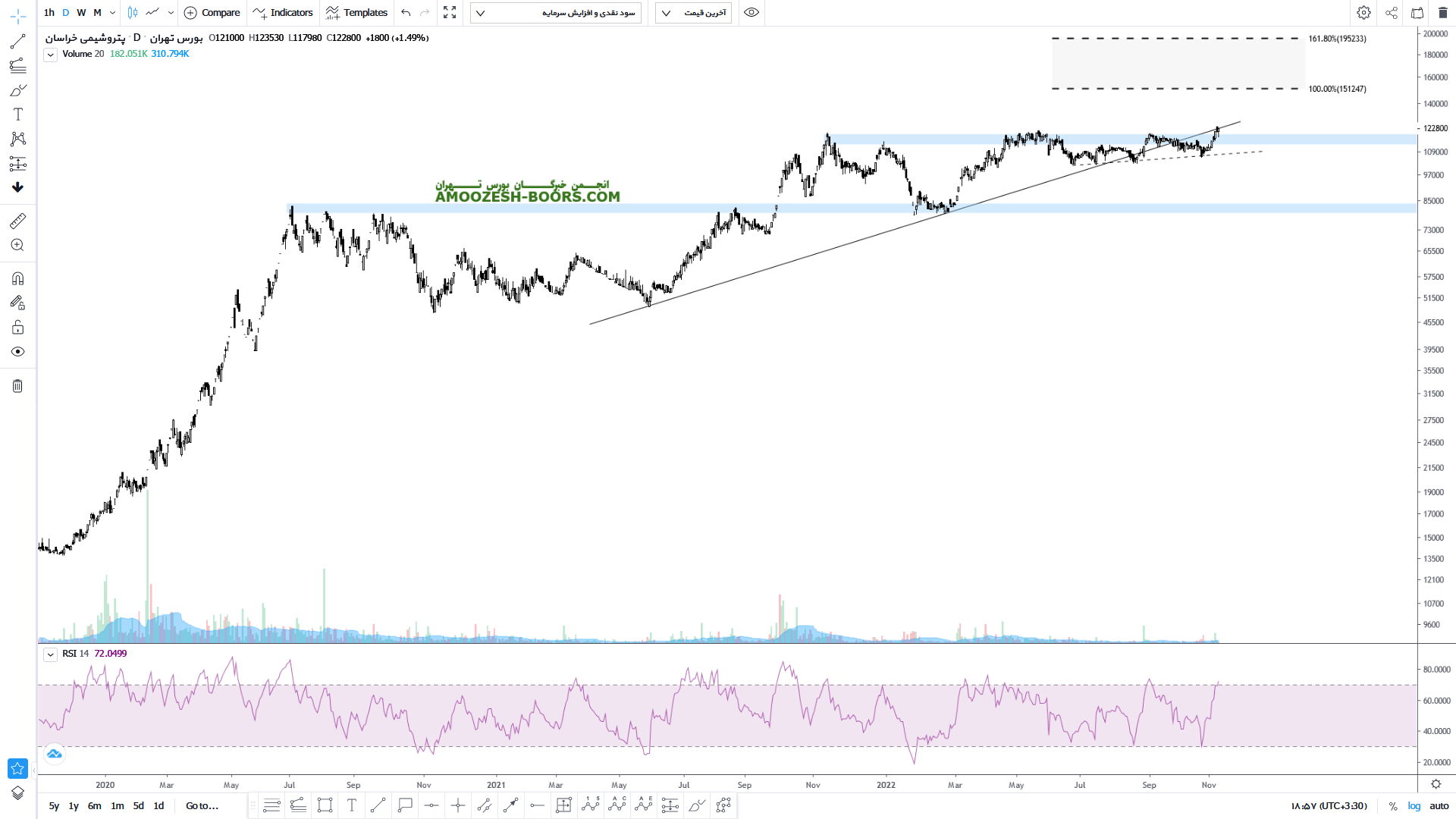 قیمت نماد خراسان پس از تست پنج باره مقاومت مهم ناحیه ۱۲ هزار تومان اکنون در حال شکست این مقاومت مهم می باشد لذا در صورت تثبیت شکست این ناحیه مقاومتی قیمت می تواند رشد خود را تا ناحیه مقاومتی ۱۵۰۰۰تومان نیز ادامه دهد اما در صورت عدم توانایی قیمت در شکست کامل این ناحیه مقاومتی می تواند با برگشت مجدد به زیر این ناحیه همچنین با شکست خط روند خود ناحیه حمایتی ۸۲۰۰ تومان اصلاح خود را ادامه دهد.