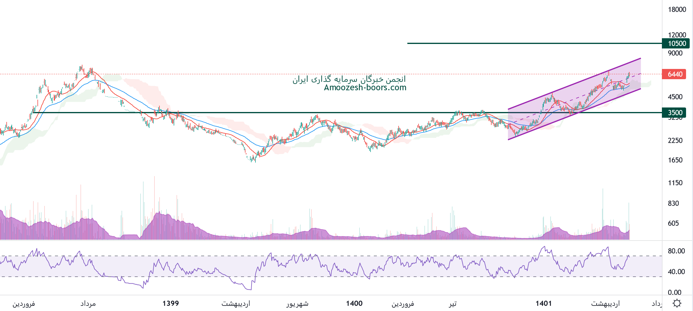 نماد خریخت که در کانال صعودی قرار گرفته در حال حاضر نزدیک محدوده مقاومتی 7000 ریال میباشد و چارت از ریسک بالایی برخوردار است، در صورت واکنش منفی به این محدوده اصلاح قیمت تا محدوده 5000 ریال محتمل خواهد بود، همچنین در صورت ادامه دار شدن فشار تقاضا و عبور قیمت سهم خریخت از محدوده مقاومتی ذکر شده، تارگت سهم 10500 ریال در نظر گرفته خواهد شد.