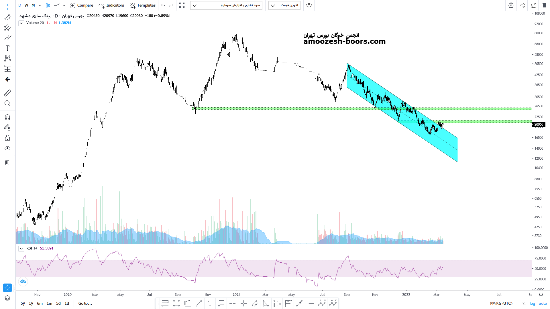 خرینگ با ایجاد واگرائی مثبت در محدوده حمایتی میدلاین کانال نزولی کوتاه مدت و همچنین حمایت استاتیک و روانی عدد رند 20000 ریال واقع شده است در صورت تثبیت مقاومت های 24000 و 28000 ریال بر سر راه سهم  و درصورت ادامه فشار فروش اصلاح قیمتی تا کف کانال ادامه دار بوده و حد ضرر را فعال مینماید.