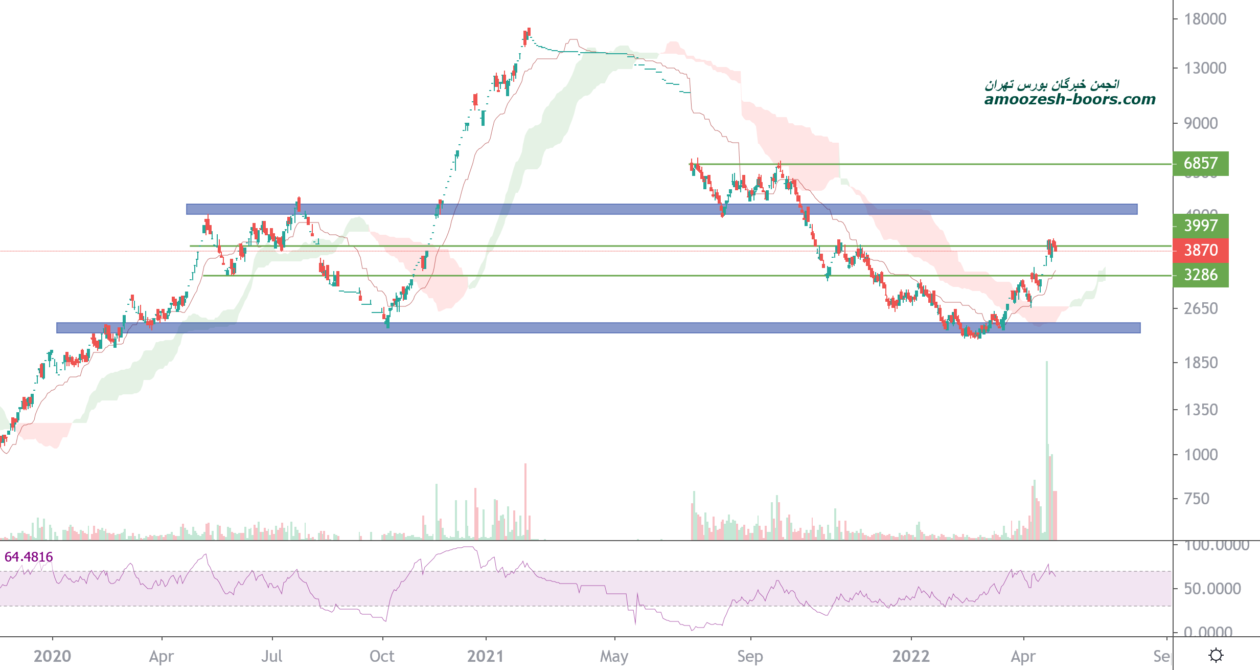 در حال حاضر قیمت درگیر مقاومت 4000 ریال میباشد،در صورت ادامه دار شدن فشار تقاضا و شکست این مقاومت حرکت قیمت تا 5000 ریال محتمل خواهد بود و در صورتی که قیمت وارد فاز اصلاحی شود اولین حمایت سهم 3300 ریال در نظر گرفته خواهد شد که در این صورت حد ضرر فعال خواهد شد.