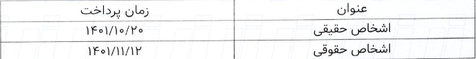 احتراما بدینوسیله زمان پرداخت سود نقدی عملکرد سال ۱۴۰۰ شرکت فنرسازی زر (سهامی عام) از طریق سامانه سجام به شرح جدول ذیل ایفاد می گردد: