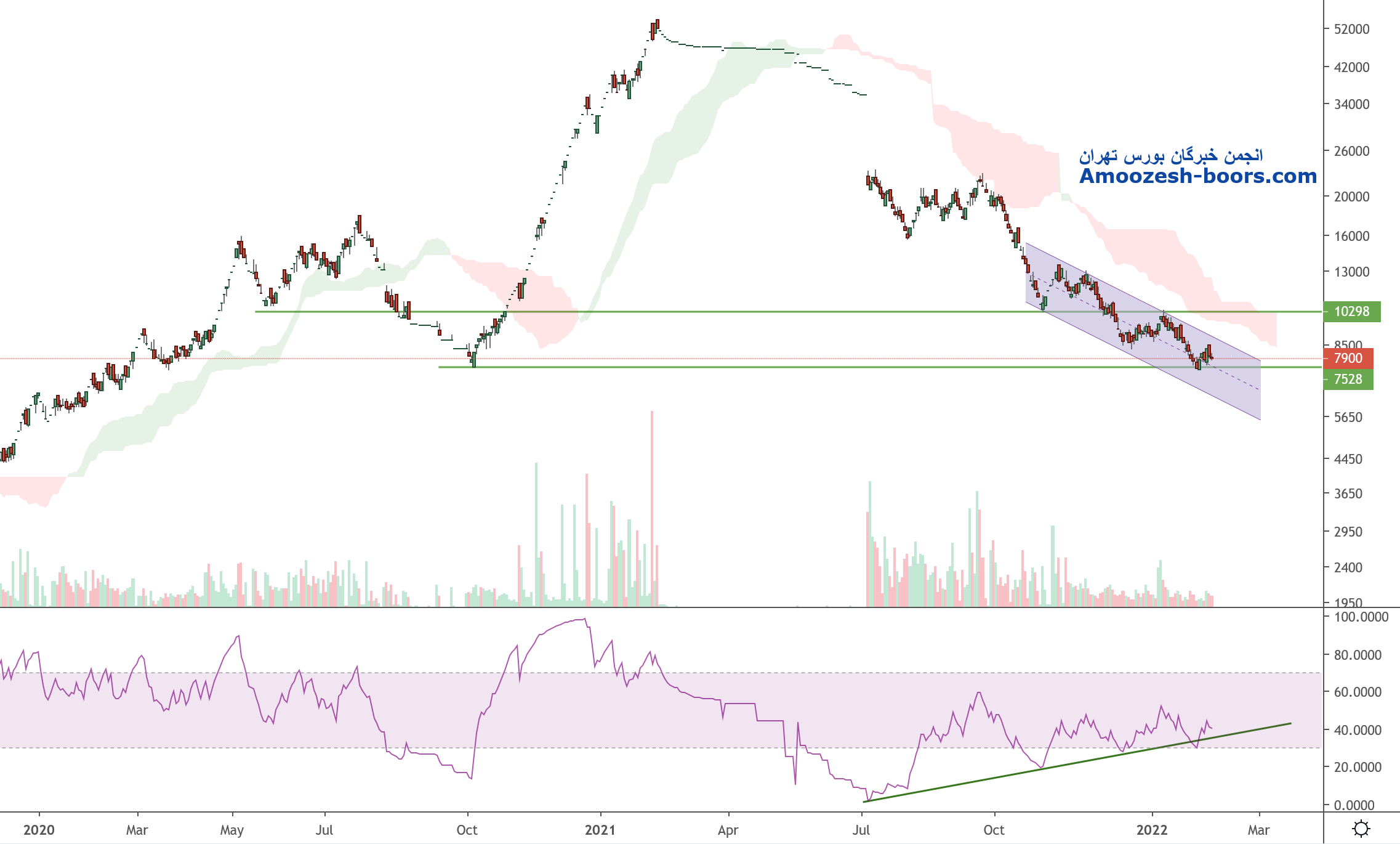 قیمت پس از خروج از کانال نزولی رشد خود را تا محدوده قیمتی 1000 تومان ادامه داده و بروز واکنش منفی به این محدوده مقاومتی مهم و همچنین با توجه به شکل کندل آخر به نظر اصلاح کوتاه مدتی را در پیش خواهد داشت در صورت بروز این اتفاق قیمت میتواند تا حمایت محدوده ۸۰۰ تومان نزول خود را ادامه دهد در صورت حمله مجدد به مقاومت محدوده 1000 تومان و شکست آن میتواند رشد خود را تا محدوده مقاومتی 1400 تومان ادامه دهد.