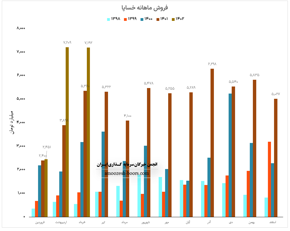 شرکت گروه خودرو سازی سایپا ( خساپا ) در آغاز سال مالی گزارش مطلوبی ارائه نداد چرا که نسبت به ماه قبل 51% کاهش و نسبت به مدت مشابه صرفا 2% عملکرد بهتری را به ثبت رسانده، فروش نماد خساپا در فروردین ماه سال 1402 معادل 2450.5 میلیارد تومان بوده است و 1% از این درآمد از طریق صادرات تامین شده است، محصول پر فروش سهم خساپا خانواده X200 (تیبا، کوئیک و ساینا ) میباشد که نرخ فروش این محصولات نسبت به ماه قبل بدون تغییر خاصی گزارش شده اما مقدار تولید و فروش افت 59 درصدی داشته است.
