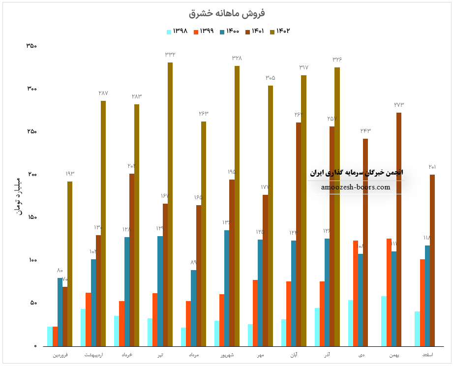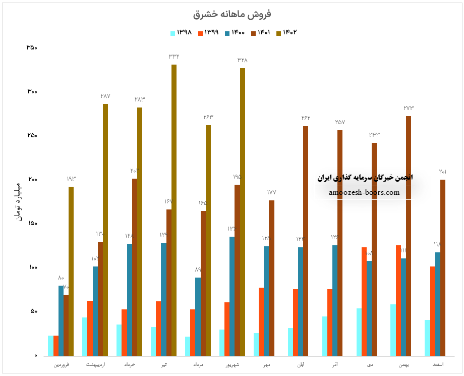 درآمد آبان ماه سال 1402 سهم خشرق 316.9 میلیارد تومان بوده است که در مقایسه با ماه گذشته 4% رشد داشته است.