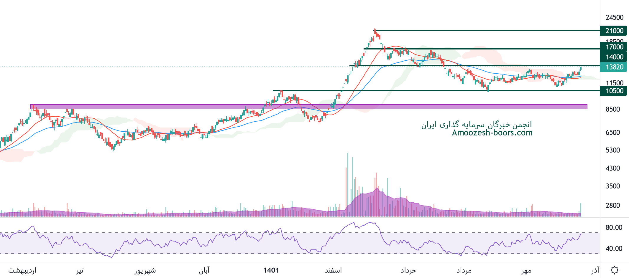 در بررسی نمودار تکنیکال نماد خشرق، قیمت سهم در حال حاضر سطح مقاومتی 14000 ریال را دارا میباشد، در صورت ادامه دار شدن روند صعودی و عبور قیمت خشرق از این سطح مقاومتی، مقاومت بعدی سهم خشرق سطح 17000 ریال ارزیابی میگردد، همچنین در صورت ورود قیمت به فاز اصلاحی، اولین حمایت خشرق 10500 ریال در نظر گرفته خواهد شد.