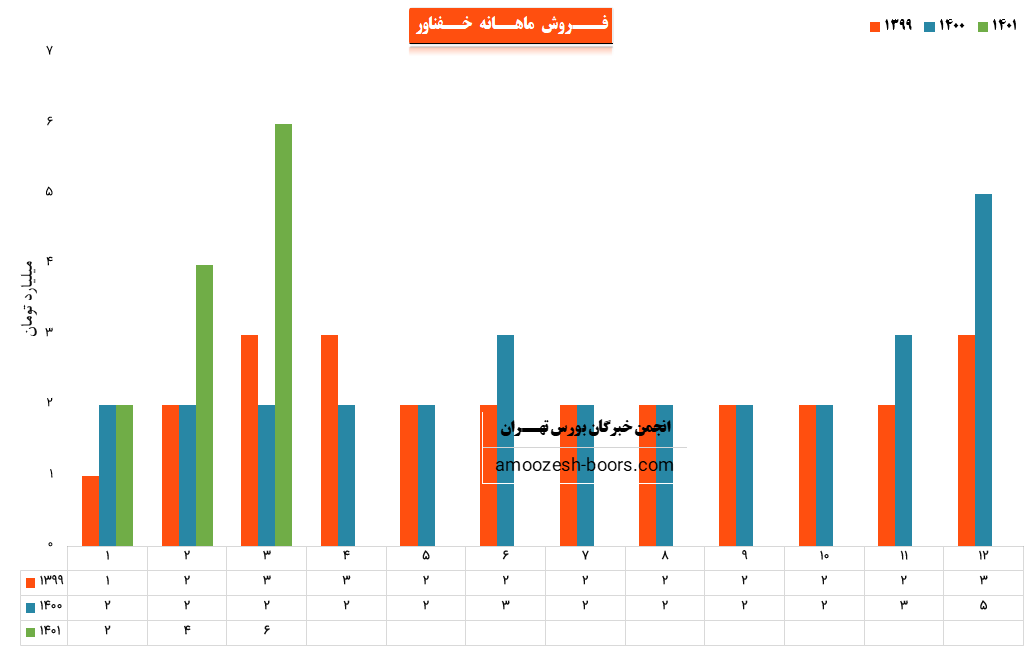 خفناور در انتهای خرداد ماه معادل 55,594 میلیون ریال از محصولات خود را به فروش رسانده است که نسبت به ماه قبل 47% افزایش و نسبت به میانگین ماه های قبل 89% افزایش داشته است.