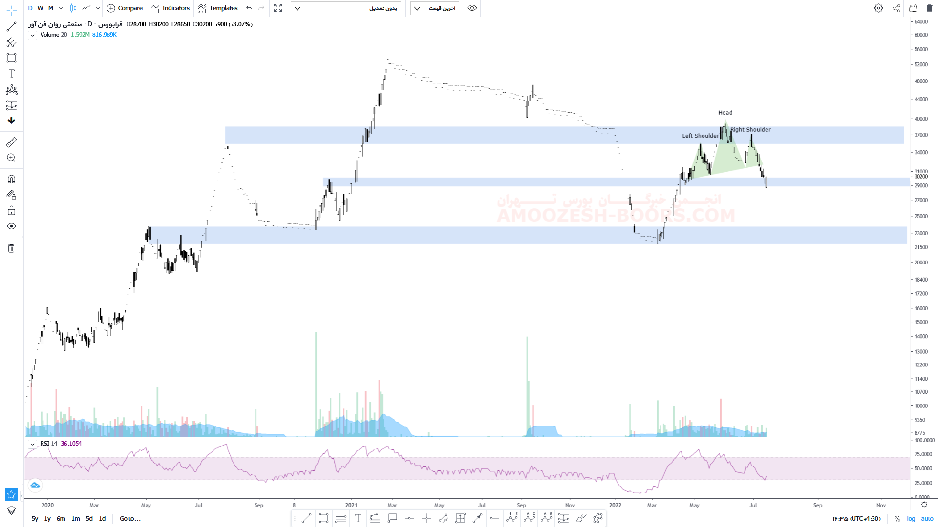 قیمت سهم خفناور پس از تست سه باره ناحیه مقاومتی ۳۷۰۰ تومان و با ایجاد یک الگوی سر و شانه سقف نزول خود را آغاز کرده است. در همین راستا حمایت ناحیه 3000 تومان را پیش روی خود دارد که در صورت حمایت می تواند مجددا تا مقاومت ناحیه ۳۷۰۰ تومان رشد کند اما در صورت عدم حمایت و تمایل قیمت به اصلاح بیشتر قیمت می تواند اصلاح خود را تا کف حمایتی ۲۳۰۰ تومان نیز ادامه دهد.