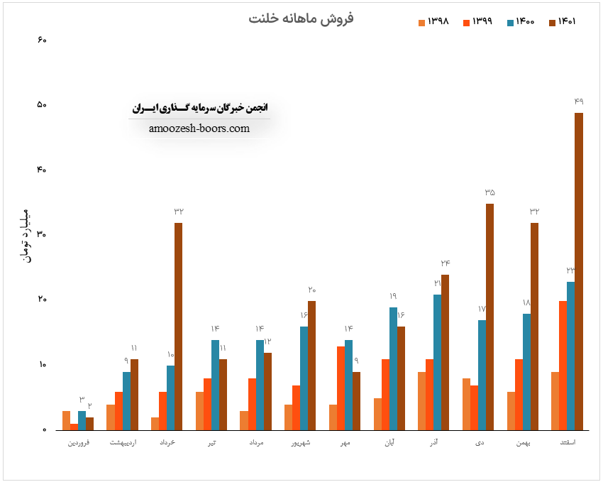 نماد خلنت در آذر ماه حدود بیش از 322 تن از محصولات خود را به فروش رسانده که این میزان در مقایسه با حجم فروش ماه گذشته خود حدود 58% افزایش پیدا کرده است.