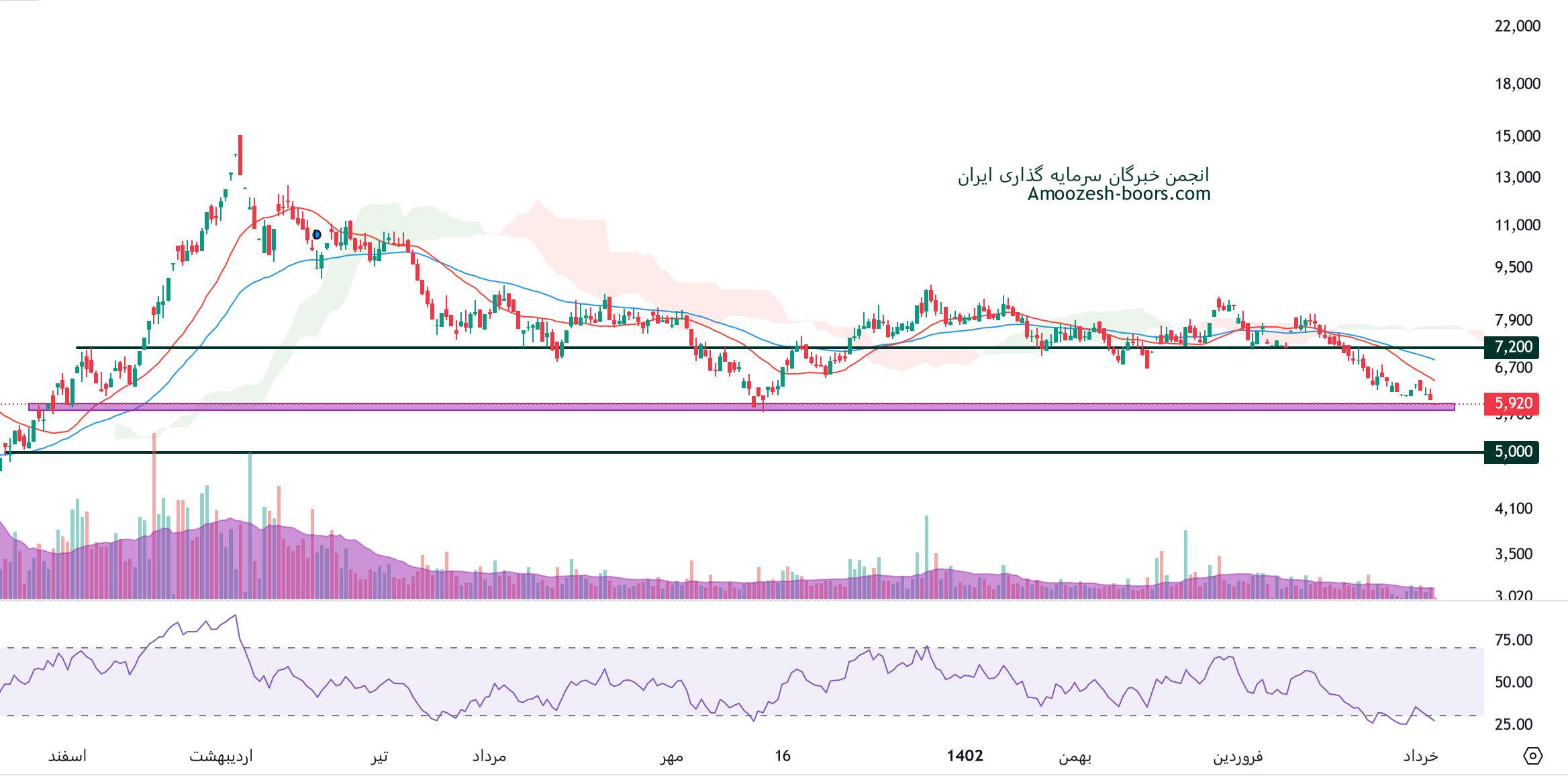 نماد خمحرکه که متاثر از جو منفی کل بازار کاماکان در فاز اصلاحی به سر میبرد، در حال حاضر به محدوده حمایتی رسیده، باید منتظر طرز واکنش قیمت به این محدوده حمایتی ماند ( حمایت خمحرکه 5800 ریال میباشد )، همچنین در صورت از دست رفتن این حمایت، حمایت بعدی نماد خمحرکه 5000 ریال ارزیابی میگردد، در صورت تثبیت قیمت در این محدوده، اولین مقاومت سهم خمحرکه محدوده 7200 ریال در نظر گرفته خواهد شد.