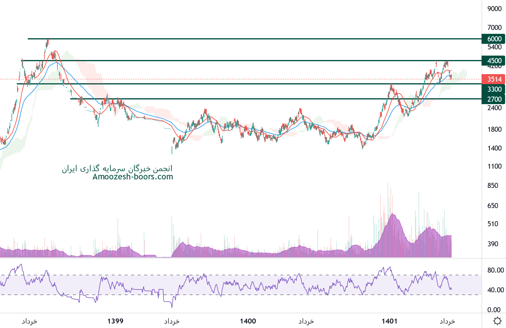 قیمت نماد خمهر مابین سطح حمایتی 2700 ریال و مقاومتی 3300 ریال قرار دارد، در صورت عبور قیمت خمهر از سطح 2700 ریال، مقاومت بعدی این سهم 4500 ریال خواهد بود، همچنین در صورت از دست رفتن سطح حمایتی 2700 ریال، اصلاح قیت سهم خمهر تا 2100 ریال ادمه خواهد داشت.
