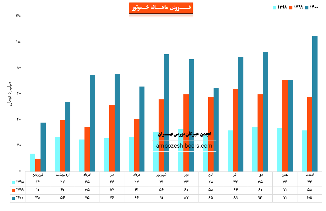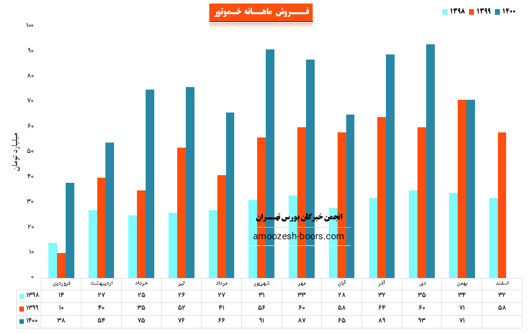 شرکت موتورسازان با نماد خموتور در بهمن ماه ۱۴۰۰ حدود مبلغ 71 میلیارد تومان درآمد داشته که این میزان در مقایسه با ماه گذشته ۲۴ % افت و همچنین در مقایسه با مدت مشابه گذشته بدون تغییر مانده است.