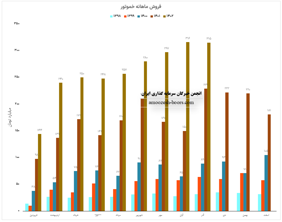 سهم خموتور (شركت موتورسازان تراكتورسازي ايران) در آذر ماه 1402 حدود مبلغ 315 میلیارد تومان درآمد داشته که این میزان در مقایسه با ماه گذشته بدون تغییر و همچنین در مقایسه با مدت مشابه سال گذشته 38% رشد پیدا کرده است.