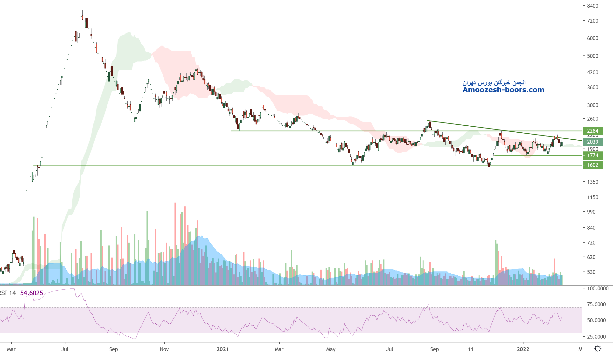قیمت با برخورد به مقاومت داینامیک نزولی وارد فاز اصلاحی شده و حمایت 1750 ریال بر سر راه سهم قرار دارد و همچنین در صورت تثبیت مقاومت مستحکم 2300 ریال مانع حرکت صعودی سهم خواهد شد.