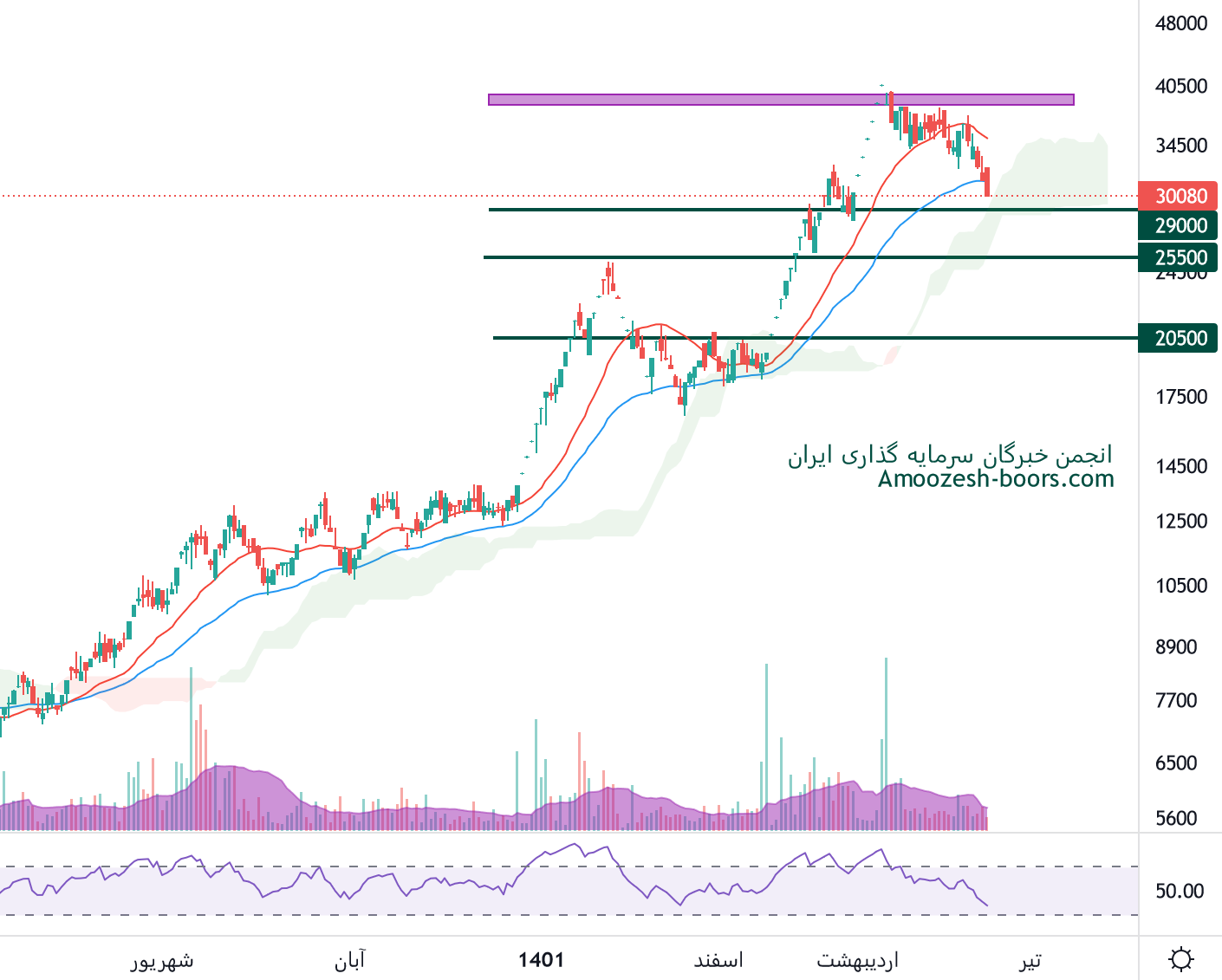 نماد خوساز که با فشار فروش بالایی همراه شده و در حال اصلاح میباشد، به سطح حمایتی 29000 ریال نزدیک شده، در صورت ادامه دار شدن اصلاح قیمت سهم خوساز، حمایت بعدی 25500 ریال در نظر گرفته خواهد شد، همچنین در صورت تثبیت قیمت و بروز نشانه های برگشت، تارگت سهم محدوده قله تاریخی در قیمت 40000 ریال ارزیابی خواهد شد.