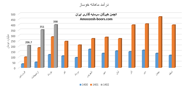 نماد خوساز در عملکرد ماهانه خرداد ماه سال 1402 به فروش 398 میلیارد تومانی دست یافته که نسبت به ماه قبل 13%، نسبت به متوسط ماهانه 43% و نسبت به مدت مشابه 39% رشد داشته است، تحلیل بنیادی خوساز نشان میدهد که مجموع عملکرد 3 ماهه از ابتدای سال مالی نسبت به مدت مشابه افزایش 68 درصدی داشته و طی این مدت 27% از کل درآمد سال گذشته پوشش داده شده است.