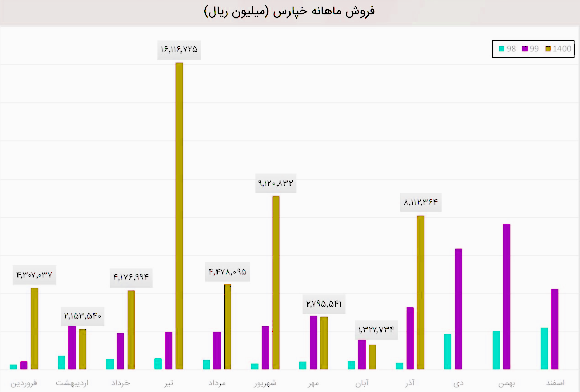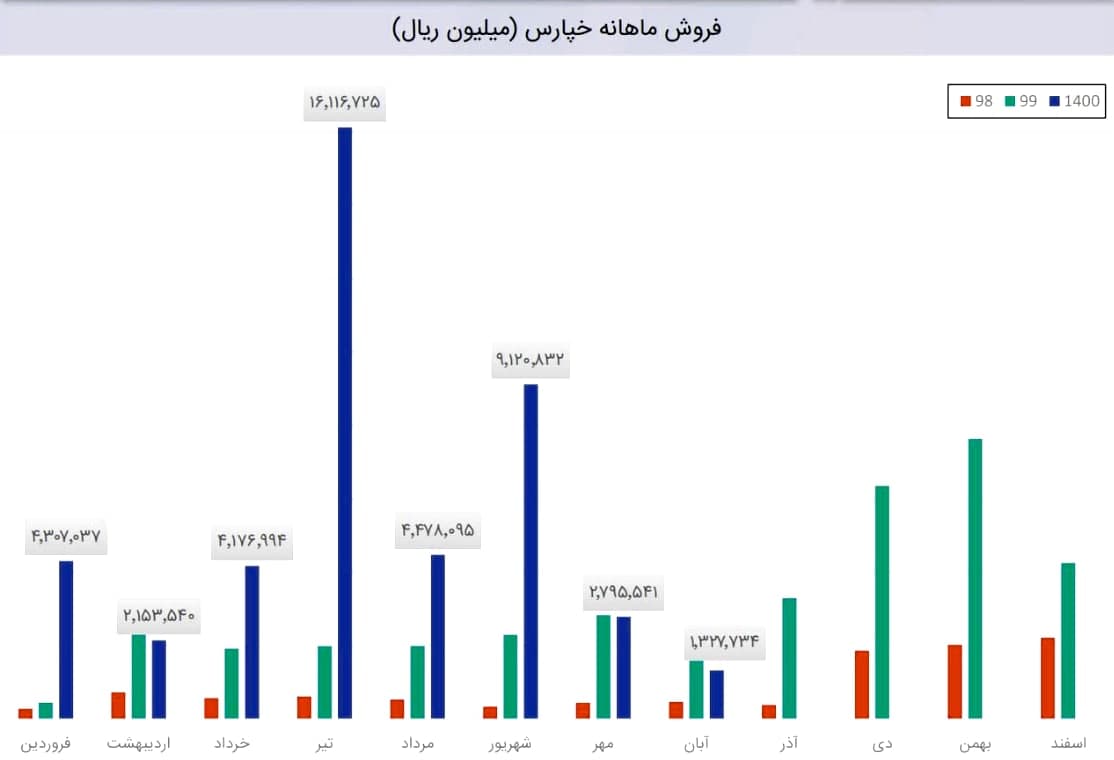 خپارس در مرداد ماه 448 میلیارد تومان فروش ثبت کرد که کاهش 72 درصدی نسبت به ماه تیر نشان می دهد. میانگین مبلغ فروش شرکت در 4 ماه ابتدایی سال مالی جاری برابر 670 میلیارد تومان بوده است.