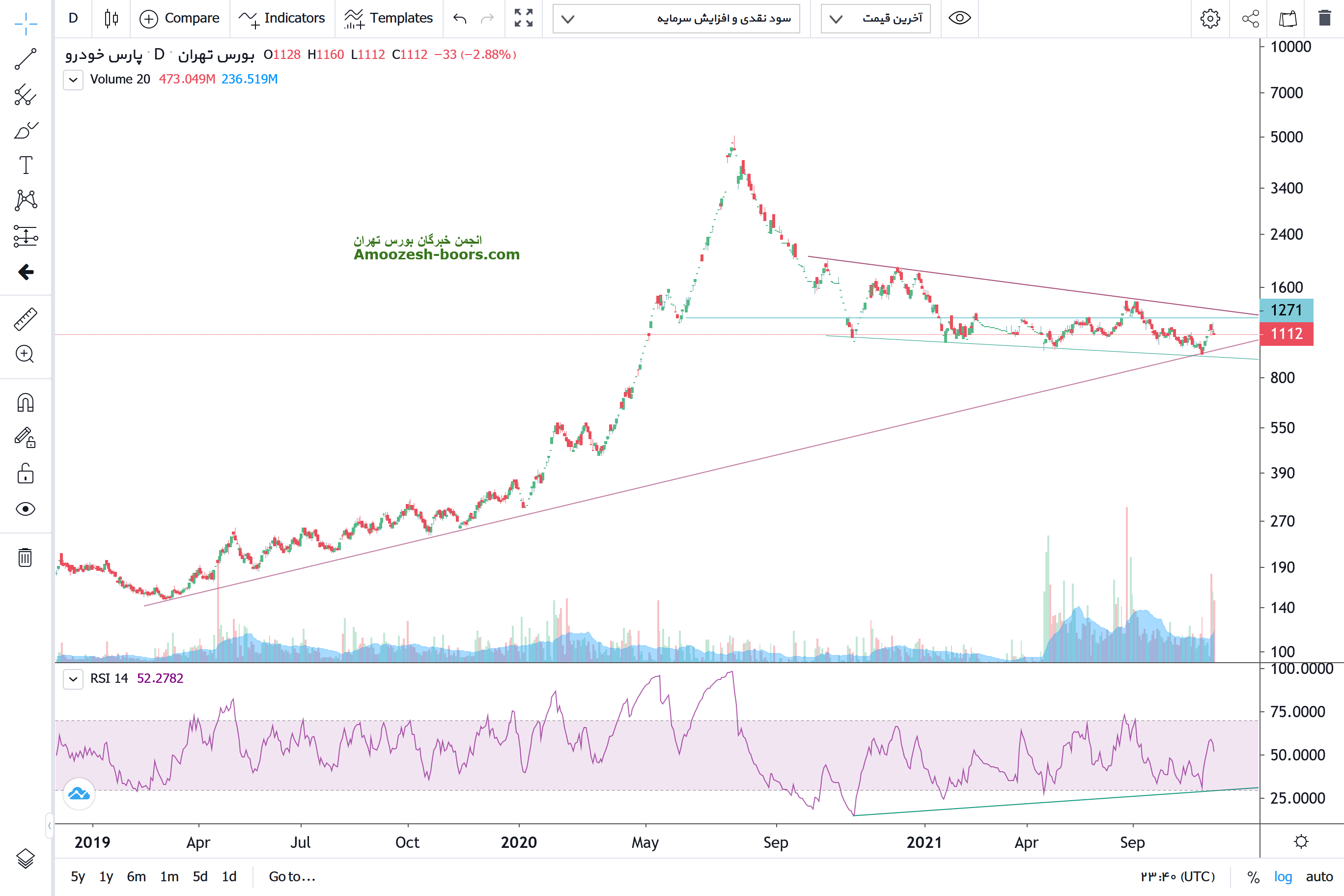 سهم با ایجاد واگرایی مثبت بر روی  منطقه حمایت قوی از ترکیب خط روند بلند مدت و حمایت داینامیک میان مدت واکنش مثبت نشان داده و انتظار میرود تا مقاومت 1300 پیش رود  پیشنهاد سیو سود روی این منطقه به معامله گران کوتاه مدتی که ازکف  ورود داشته اند میشود رعایت حد ضرر1000 ریال برای معامله گران الزامیست همچنین در صورت شکست مقاومت داینامیک نزولی مقاومت های 1450 و 1850 به ترتیب بر سر راه سهم هستند .