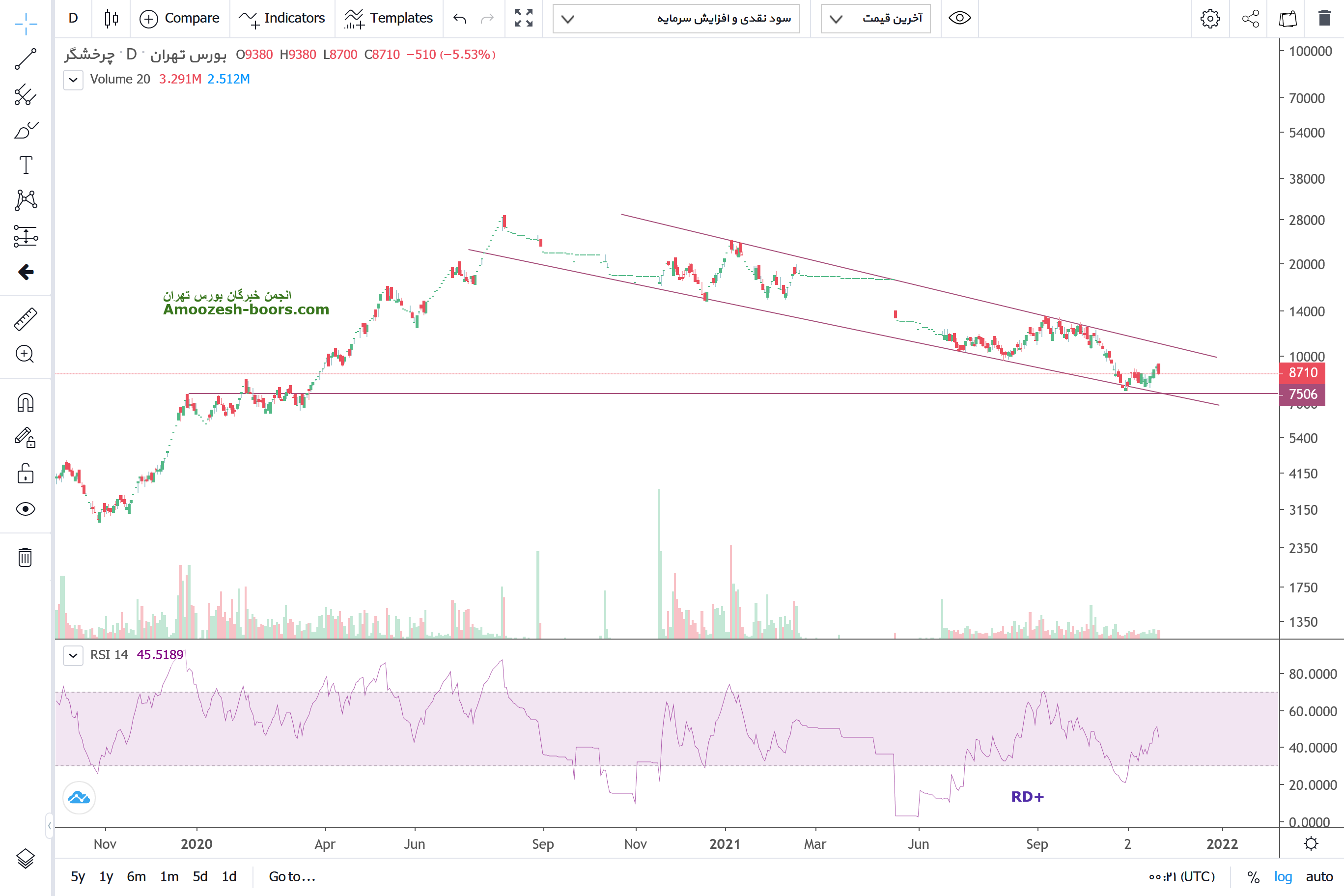 خچرخش از معدود چارت هایی هست که پس از اصلاح قیمتی عمیق، باز به زیر کف کانال نزولی خودش نفوذ پیدا کرده،ایجاد واگرایی مثبت و محدوده حمایتی 75000 ریال منطقه حمایتی جهت مانع شدن از ریزش قیمت سهم خواهد شد با توجه به ریزش قیمتی عمیق محتمل هست که قیمت درین محدوده تثبیت و نوسان مثبتی دهد و فرصتی برای اصلاح سبد به سهامداران دهد همچنین باید در نظر داشت 10000ریال مقاومت و 70000 ریال اولین منطقه حمایتی پس از مشخص شدن تثبیت قیمت سهم خواهد بود.