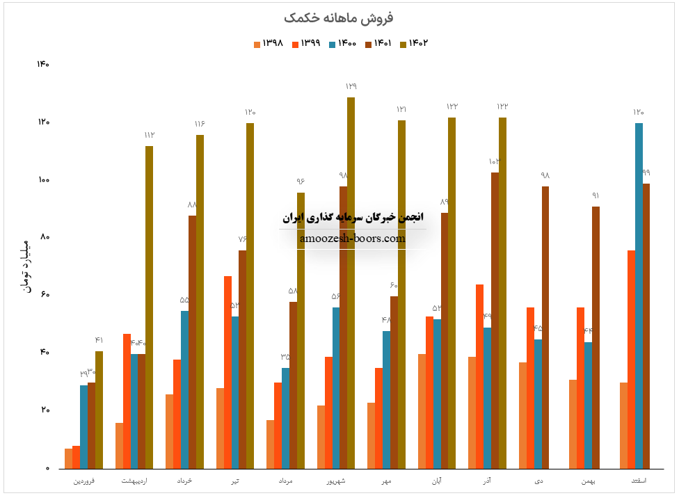 سهم خکمک در آذر ماه حدود بیش از 633/100 عدد از محصولات خود را به فروش رسانده که این میزان در مقایسه با حجم فروش ماه گذشته خود حدود 26% افزایش پیدا کرده است.