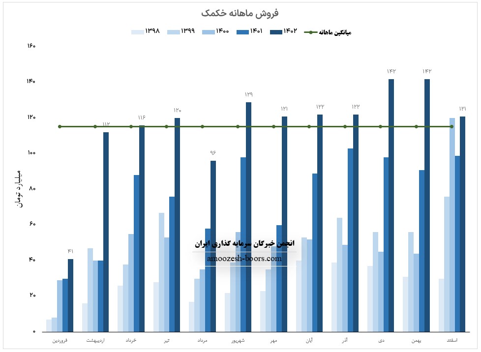 شرکت کارخانجات کمک آیندامین سایپا ( خکمک ) در بهمن ماه 1402 فروش 142.1 میلیارد تومانی را به دست آورده که کاهش 0.2 درصدی در مقایسه با ماه گذشته و همچنین رشد 24 درصدی نسبت به متوسط ماهانه داشته است،