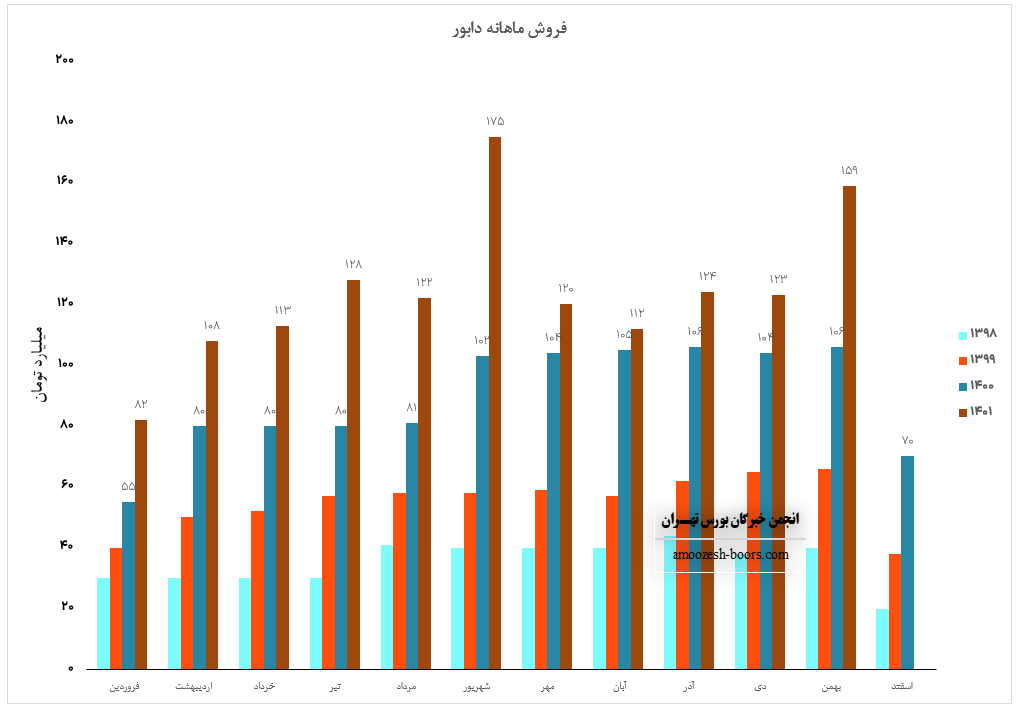 دارو سازی ابوریحان با نماد دابور در اسفند ماه به درآمد 149.7 میلیارد تومانی رسیده است، 3% از این درامد از طریق صادرات و مابقی از طریق فروش داخلی تامین گردیده است، هرچند درآمد اسفند ماه نماد دابور نسبت به ماه قبل افت 6 درصدی داشته اما نسبت به متوسط ماهانه و مدت مشابه به ترتیب رشد 15 و 114 درصدی را تجربه نموده است، مجموع عملکرد 12 ماهه سهم دابور افزایش 39 درصدی به کل درآمد سال گذشته داشته است، گروه آمپول بیشترین وزن سبد فروش سهم دابور را به خود اختصاص داده است، مقدار تولید این محصول نسبت به ماه قبل 2% مقدار فروش آن 29% افت داشته اند، با این وجود نرخ فروش محصول استراتژیک شرکت داروسازی ابوریحان با 15% رشد همراه بوده است.