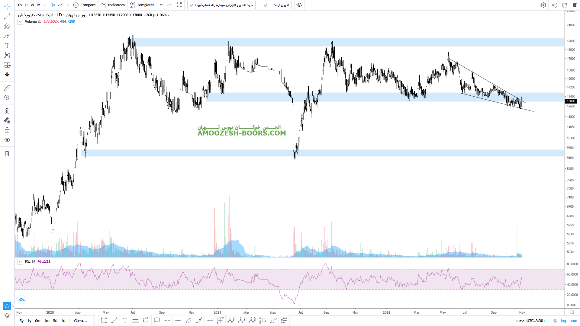 نماد دارو در گیر مقاومت 19000 ریال میباشد، در صورتی که سهم دارو وارد فاز اصلاحی شود، حمایت های سهم 17500 و 16000 ریال در نظر گرفته خواهد شد که ورود پله ای در محدوده حمایتی 17500 ریال منطقی میباشد، همچنین در صورت عبور قیمت از این مقاومت، حرکت سهم تا 20500 و 22500 محتمل خواهد بود.