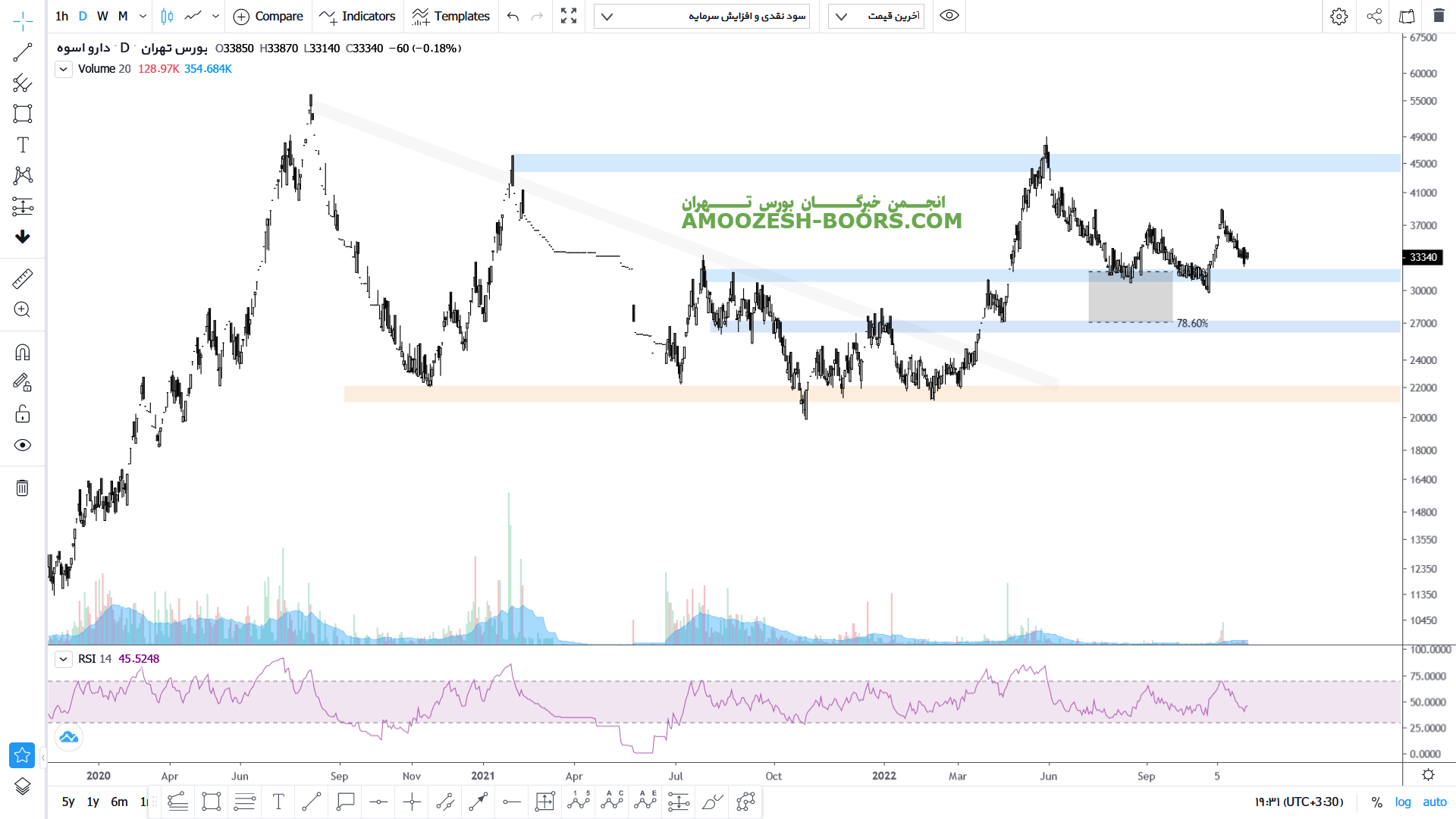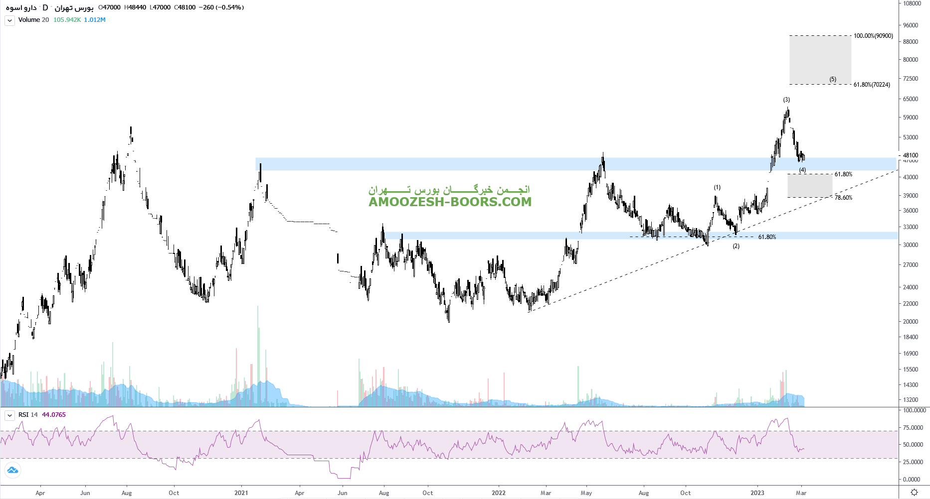 در بررسی نمودار تکنیکال نماد داسوه، قیمت سهم درگیر محدوده مقاومتی 54000 ریال میباشد، در صورتی که میزان تقاضا قدرت عبور از این محدوده را داشته باشد، مقاومت بعدی داسوه 65000 ریال ارزیابی خواهد شد، همچنین، در صورت ورود قیمت به فاز اصلاحی حمایت های سهم داسوه به ترتیب 43000 و 36500 ریال در نظر گرفته خواهند شد.