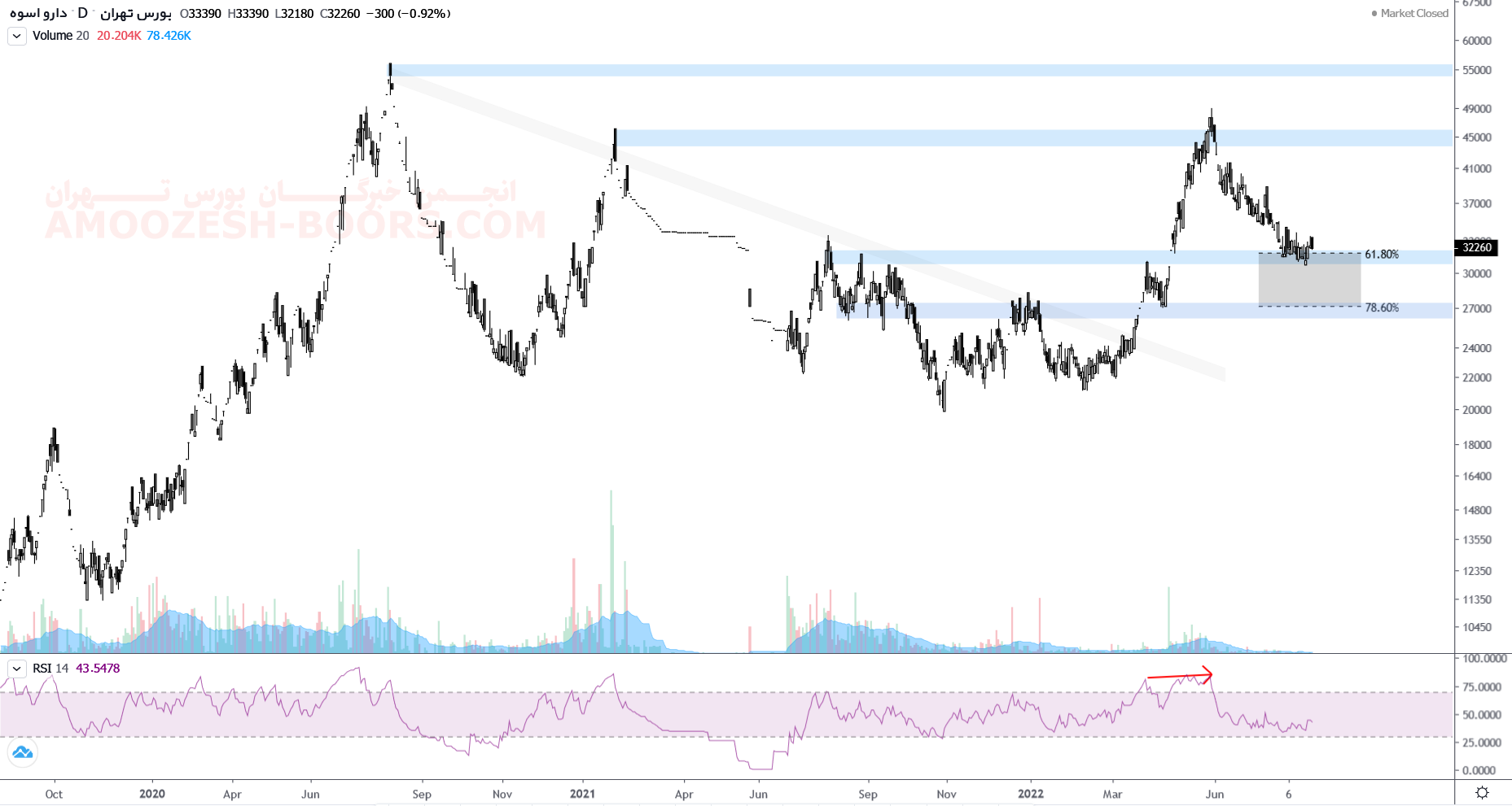 قیمت سهم داسوه پس از ایجاد واگرایی منفی و کاهش قدرت خریداران از ناحیه ۴,۴۰۰ تومان وارد اصلاح شده و اکنون نیز به ناحیه حمایتی ۳,۲۰۰ تومان رسیده است لذا در صورت حمایت از این ناحیه سیگنال ورود صادر و سهم داسوه میتواند رشدی را تا ناحیه مقاومتی ۴,۵۰۰ تومان تجربه کند اما در صورت عدم حمایت و از دست دادن این ناحیه حمایتی قیمت می تواند خود را به ناحیه حمایتی مهم ۲۶۰۰ تومان نیز برساند.