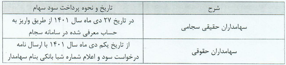 به اطلاع سهامداران محترم می رساند در جهت رعایت ماده ۱۲ دستور العمل اجرایی افشای اطلاعات شرکت های ثبت شده نزد سازمان بورس و اوراق بهادار، پرداخت سود نقدی مصوب مجمع عمومی عادی سالیانه مورخ ۱۴۰۱/۰۳/۰۹ مربوط به سال مالی منتهی به ۱۴۰۰/۱۲/۲۹ این شرکت به ازای هر سهم ۲,۲۰۰ ریال به سهامدارانی که در زمان برگزاری مجمع مالک سهام بوده اند طبق جدول ذیل پرداخت خواهد شد.
